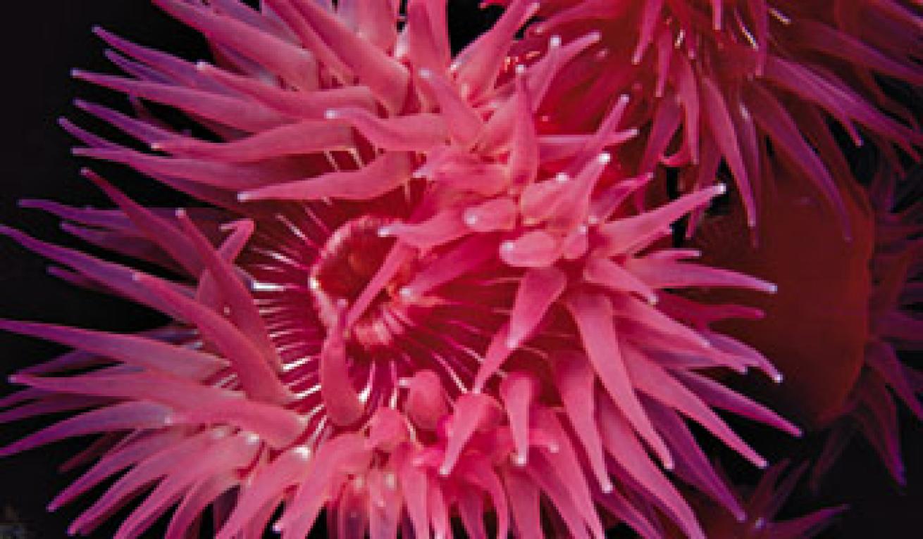 Pink anemones decorate the rocky crevices where wolf eels nest in the waters off British Columbia.