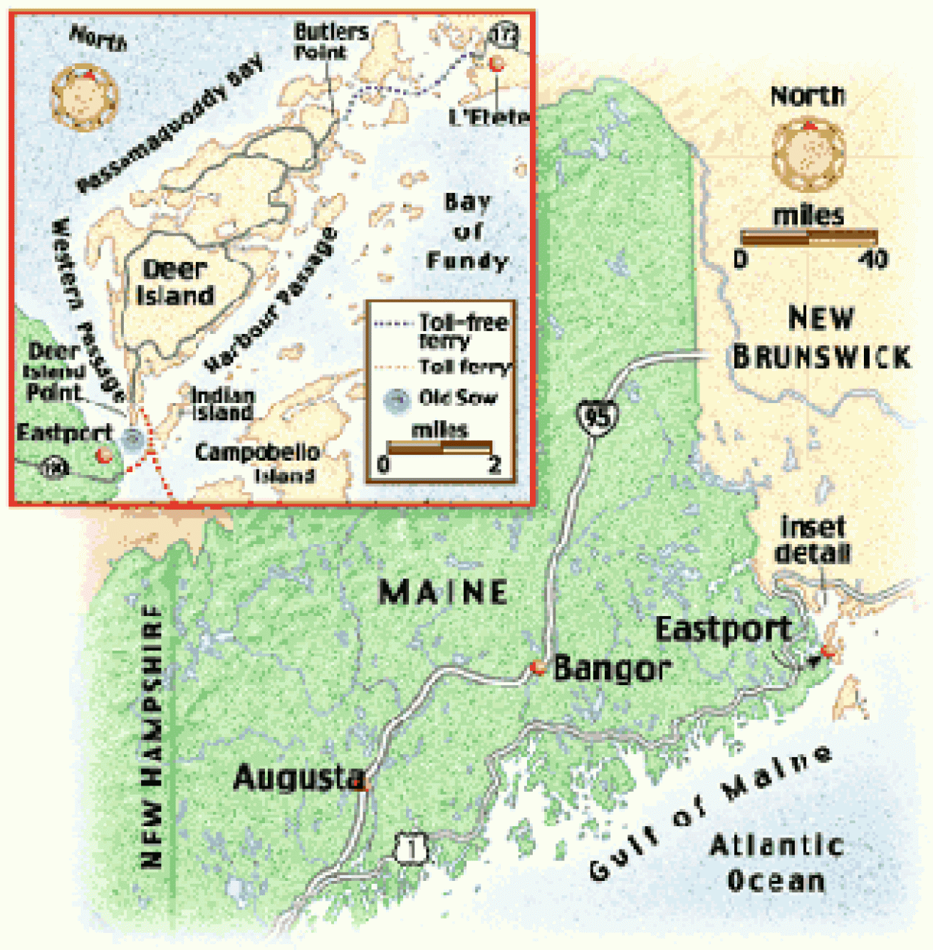 But the water was a different story. It frothed and boiled like river rapids. Driftwood bobbed and spun helplessly. Rips and eddies tore this way and that. And just off the beach, in the middle of it all, the largest tidal whirlpool in the Western Hemisphere--nicknamed "Old Sow"--spun round and round like some great Hollywood special effect.
