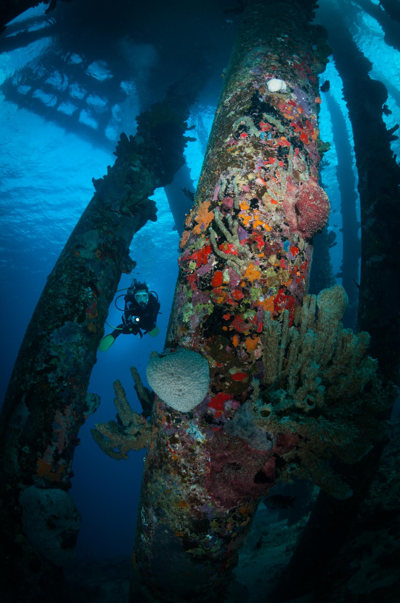 Crisscrossing columns supporting the Cargill Salt Company's pier are like lattices framing the sun's rays, an impressive backdrop for wide-angle underwater photography. These pilings are hangouts for angelfish and trumpetfish, each scouting for food among tube sponges and stovepipe sponges. Permission is required for diving Salt Pier, so check with your dive operator before making the easy surface swim parallel to the dock's conveyors.