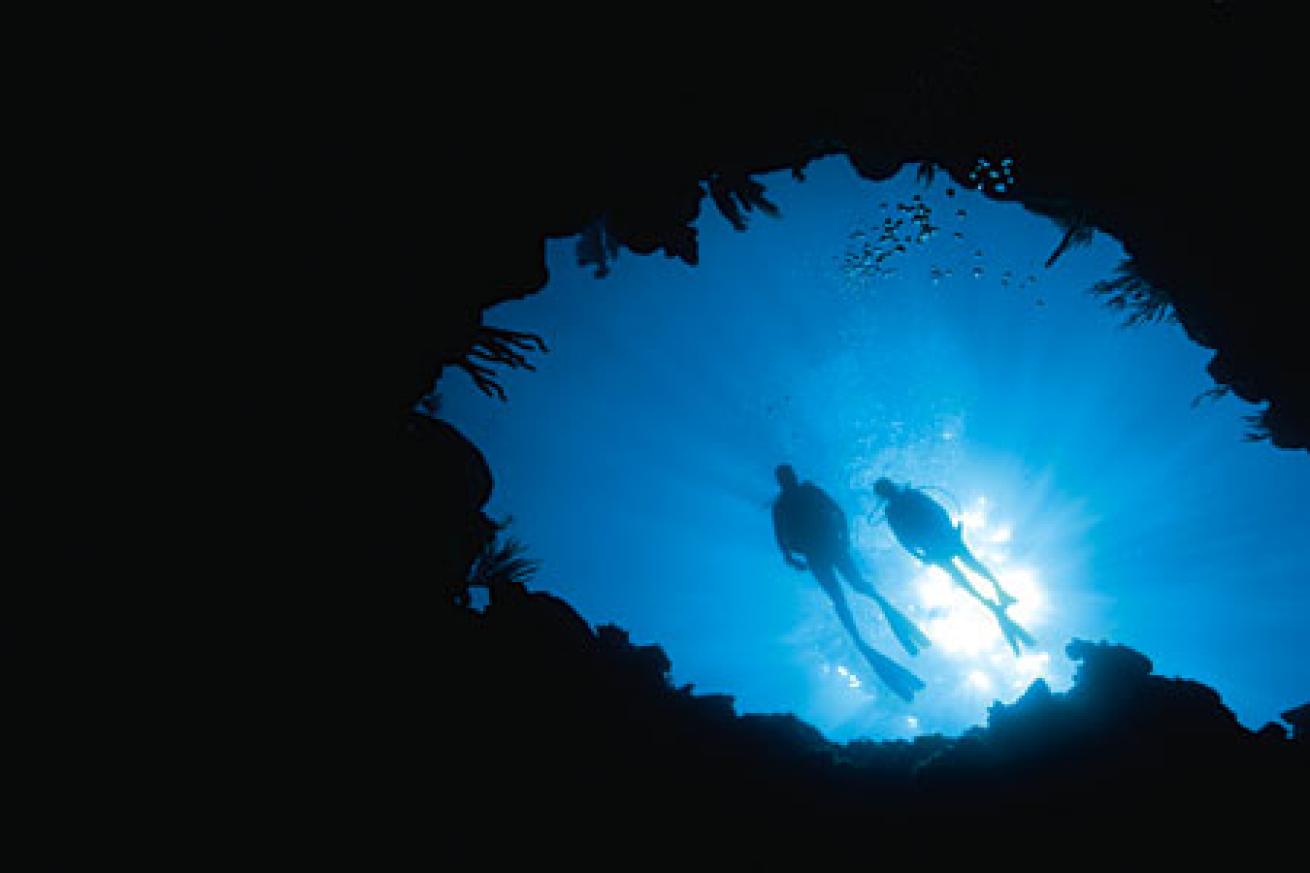 At Bonnie's Arch, it's best to dive in a small group if you're trying for a dramatic photograph of a tarpon under an arch. With the right application of strobe, you can employ the diver as an element of composition in foreground, with reef colors and angelfish in the background. When the silversides are thick at the adjacent sites, Devil's Grotto and Eden Rock, tarpon and groupers incessantly gorge themselves, creating a magic display accentuated by the spectacular cathedral lighting within their swim-throughs.