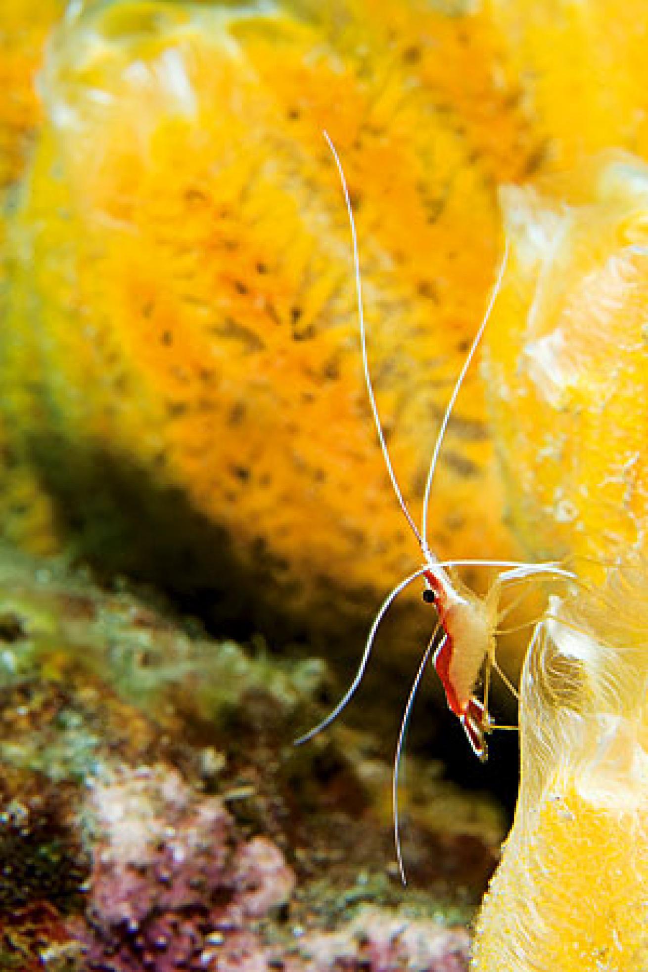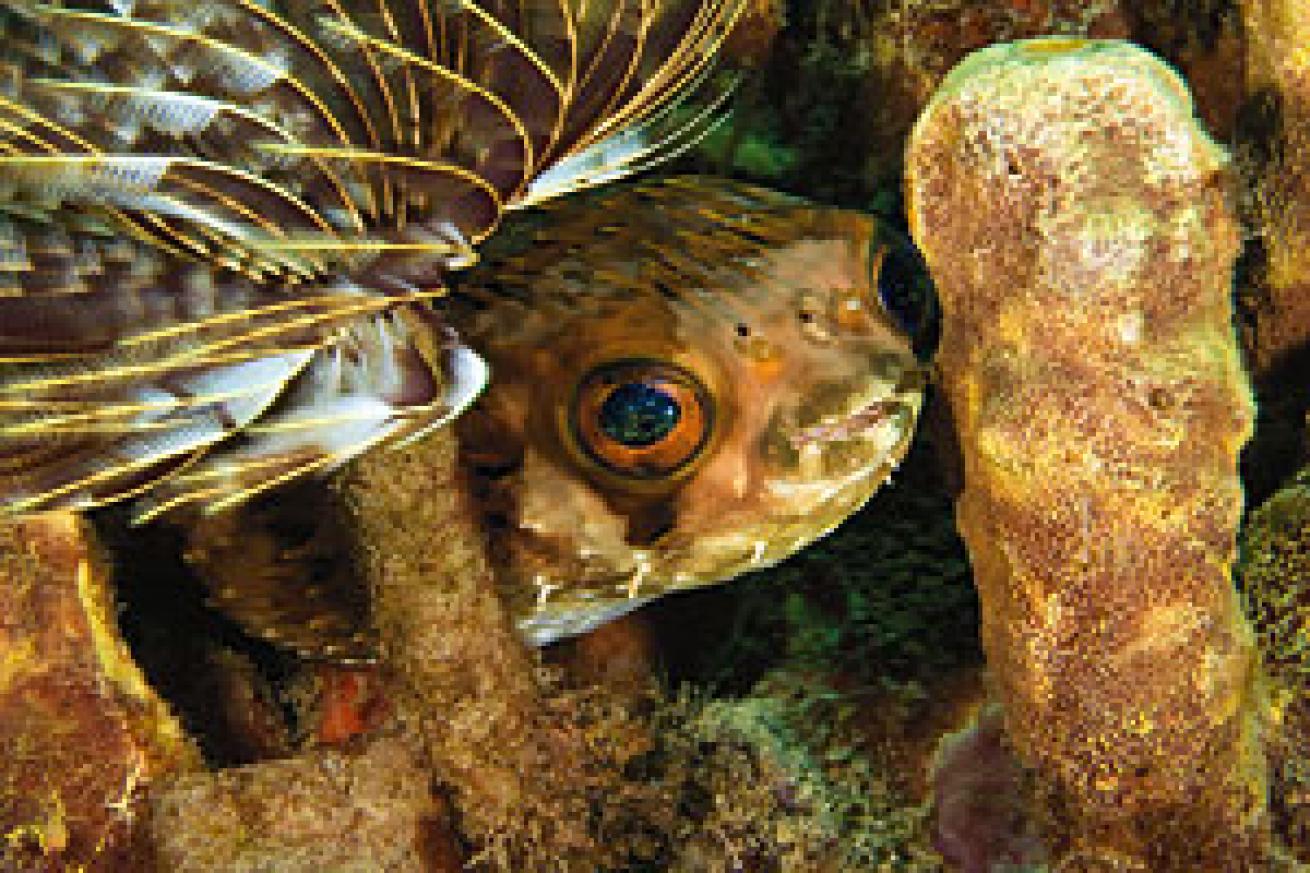 Tube Reef Here's a recently discovered spot adjacent to Toucari Caves that's about a 10- to 15-minute surface swim from a beach in the village of Toucari. Descend past coral boulders at 20 feet, then drop down into the sand. There, you'll catch comical performances--jawfish peeping their heads in and out of their hiding places and yellowline arrow crabs using their spindly arms and purple pincers to stuff their mouths with nutrients while feverishly scratching themselves. There's incredible color variety of sponges here, from fat purple barrels to delicate turquoise vases.