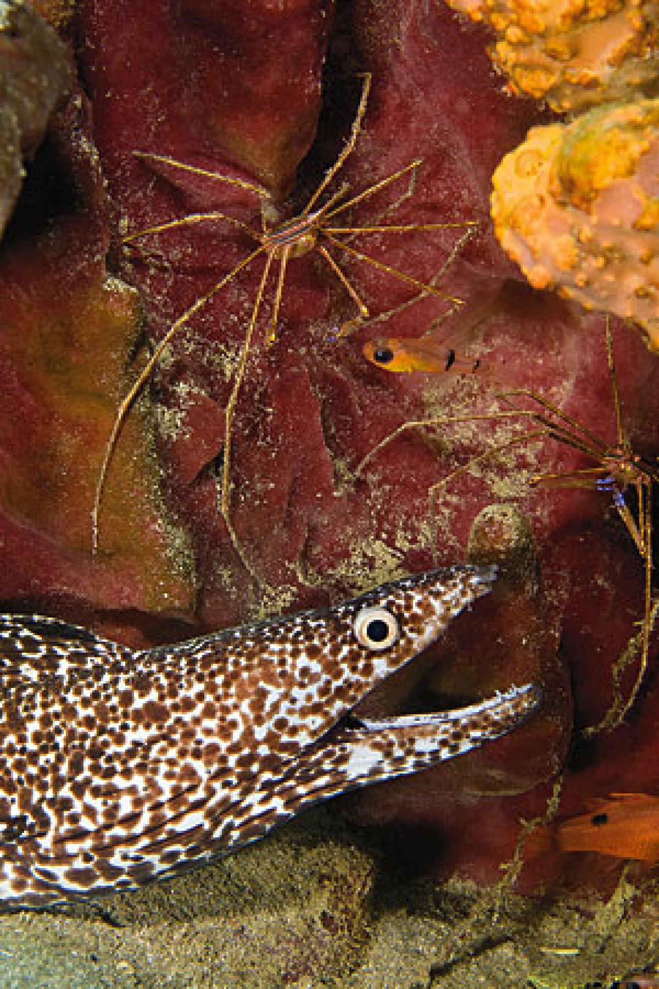 Coral Gardens This site, on a connecting ridge to Dangleben's, has a max depth of only 50 feet. Peer under the ledges and get an extreme close-up view of a sleeping nurse shark, often guarded by a security phalanx of blackbar soldierfish. This area is also a prime cleaning station, where shrimp service spotted morays. If you're really lucky you'll see a scorpionfish raise its colorful orange-black-and-white pectoral fins.
