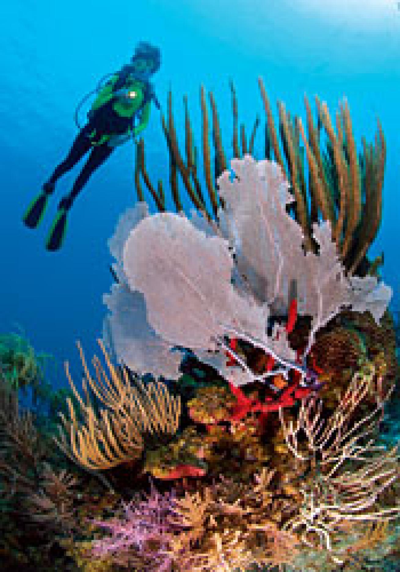The surge is strong, and sea fans sway like sagebrush on a windy mesa. We find some shelter in the tongue-and-groove coral formations that dominate the offshore topography. Carlos, our divemaster, leads us through a series of swim-throughs and slot canyons at around 50 feet. In one tunnel we spook up a baby hawksbill turtle, and in another bump into a monster loggerhead in the fading spectrum of his 50-year lifespan.