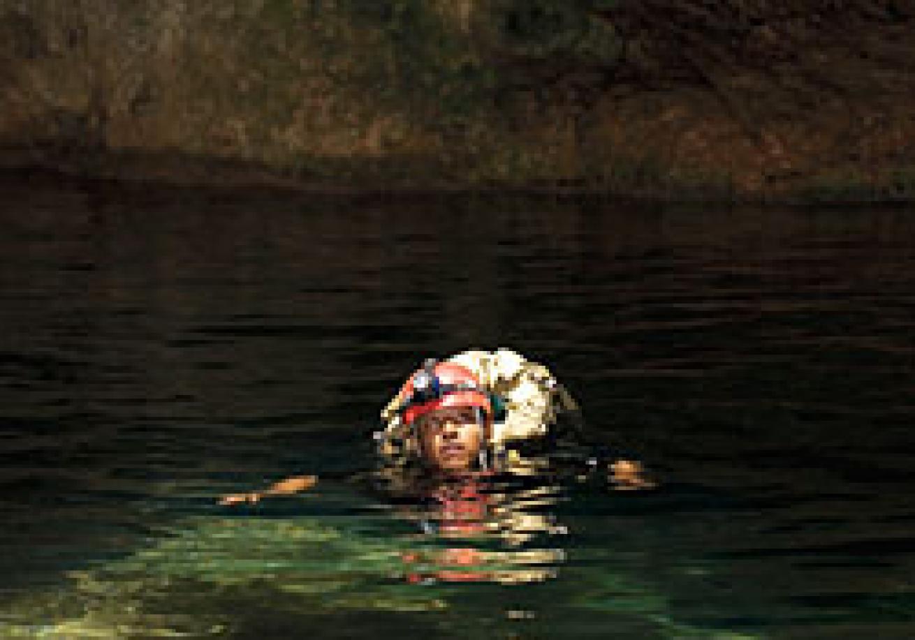 I feel the cave before I see it, the cool, damp whisper of 72-degree air bleeding through the triple-digit heat. While I pack my cameras into a dry bag at the hourglass entrance-a clear river flows out of the entrance, so we will have to swim inside-I spot Rudy standing with his eyes closed at the entrance. "Saying a prayer?" I ask. "Asking permission," he says. "From the gods who live here."
