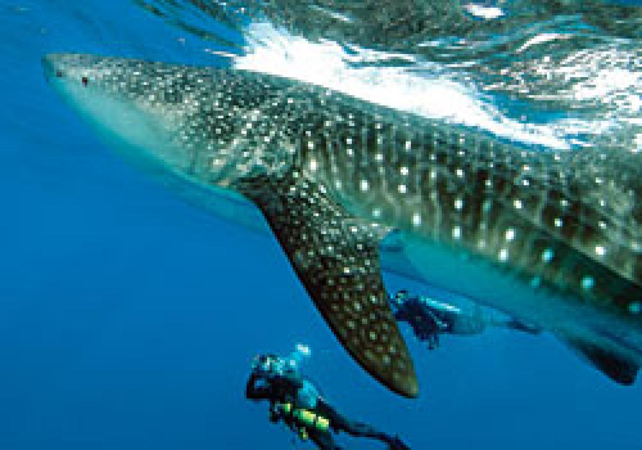 "Want to see what they look like?" the diver next to me asks. "We saw five the day before yesterday." Before I can say anything, he powers up his digital point-and-shoot and clicks through image after image of whale sharks feeding in the light blue surface water.
