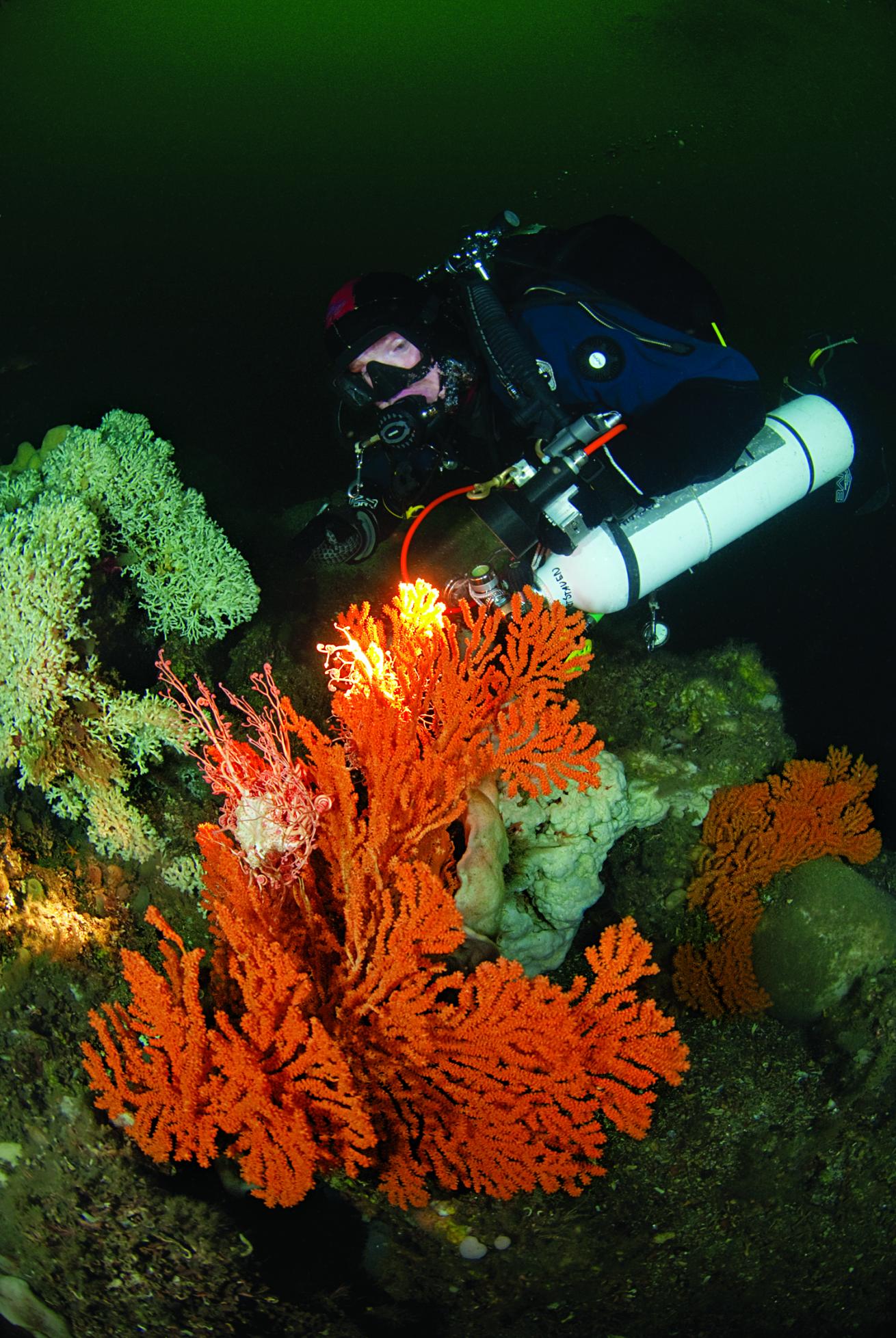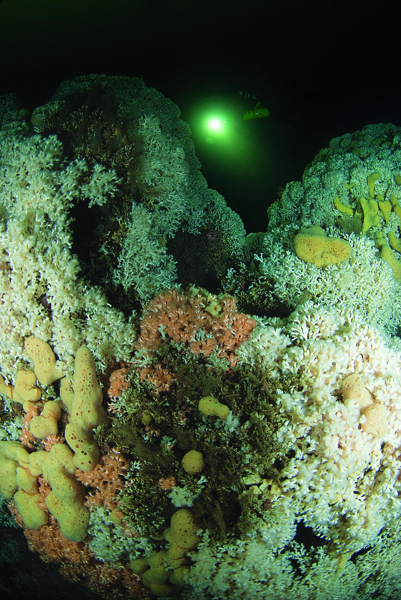 Simon BrownWhite and peach variants of lophelia cold-water corals, typically found from 500 to 3,000 feet thrive on a reef in just 140 feet.