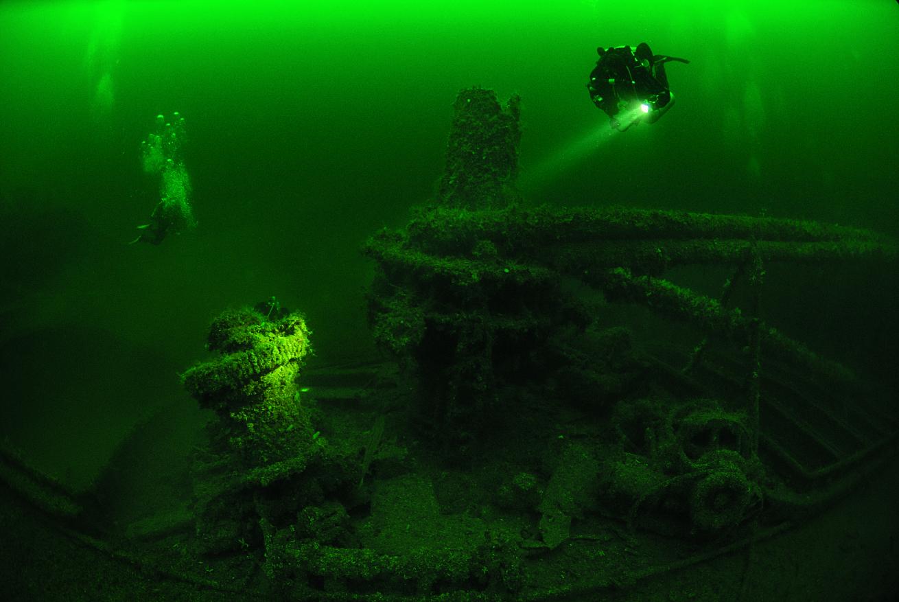 Finning over the bow at 150 feet, I turn and look back to see a ghostly ship looming out of the wall of dark green fog; but I’m already in deco and can’t linger. We turn and follow the port rail back to the ascent line. When wrecks are well preserved, navigation is easy and we pause at the engine skylights. It’s possible to penetrate the wreck here, but the engine room bottoms out at 180 feet and is very silty — not the place to venture without training and planning, and a whole lot more gas. Back at the stern, I’m in sport-diving depths, but the mandatory stops are approaching 30 minutes, and there’s just time to check out the emergency steering gear before switching to 50 percent deco gas and starting the ascent.