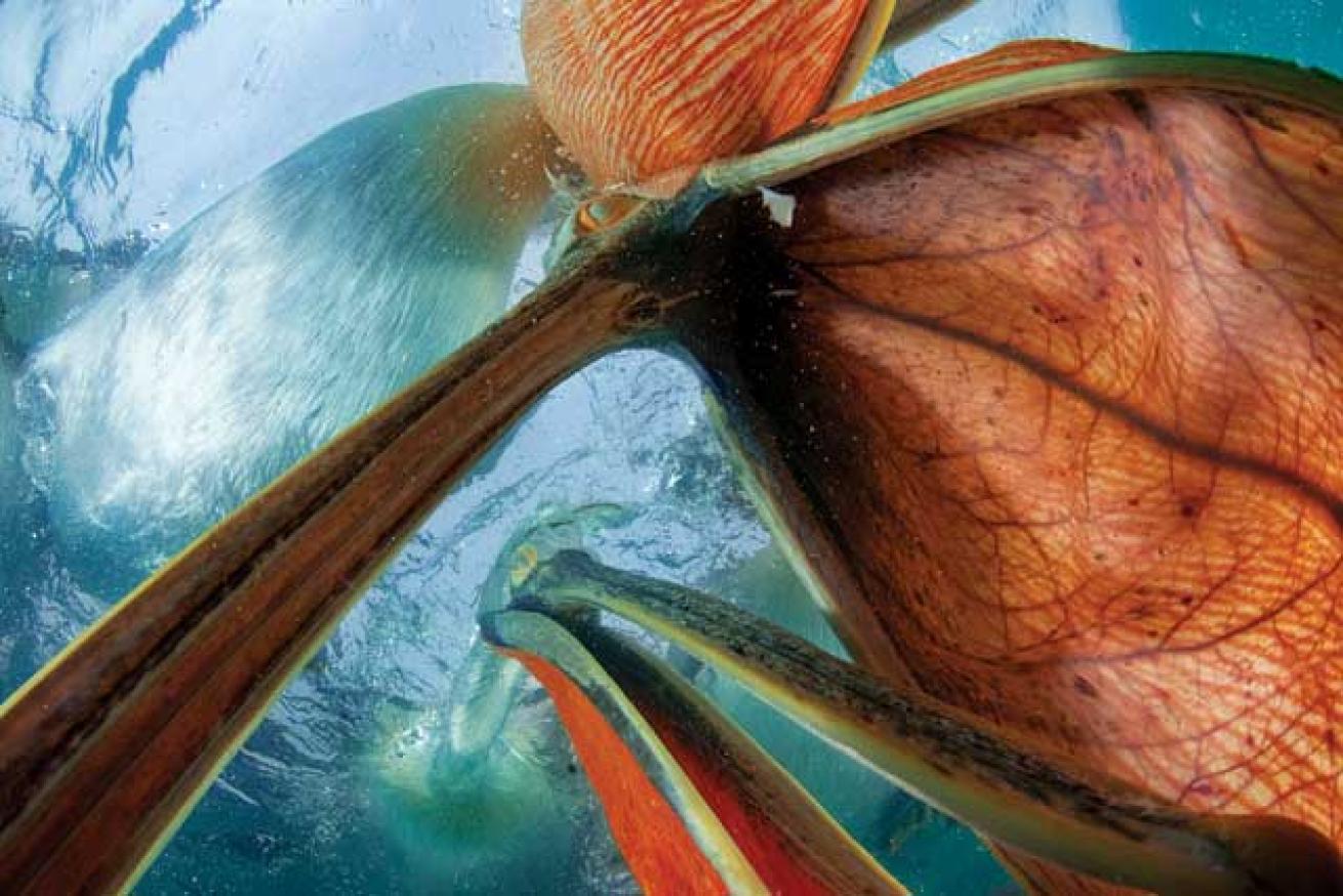 The huge dalmatian pelicans of Lake Kerkini are fascinating for their size and spectacular breeding colors: bright-orange bill pouches set against silvery-white plumage. What I most wanted was an underwater view of the great bills at work, so I built a large, floating deepwater pool, designed a complicated water-filtering system and then devised a way to photograph the birds remotely. Eventually, attracted by bait, the pelicans started to hunt in the clear pool.