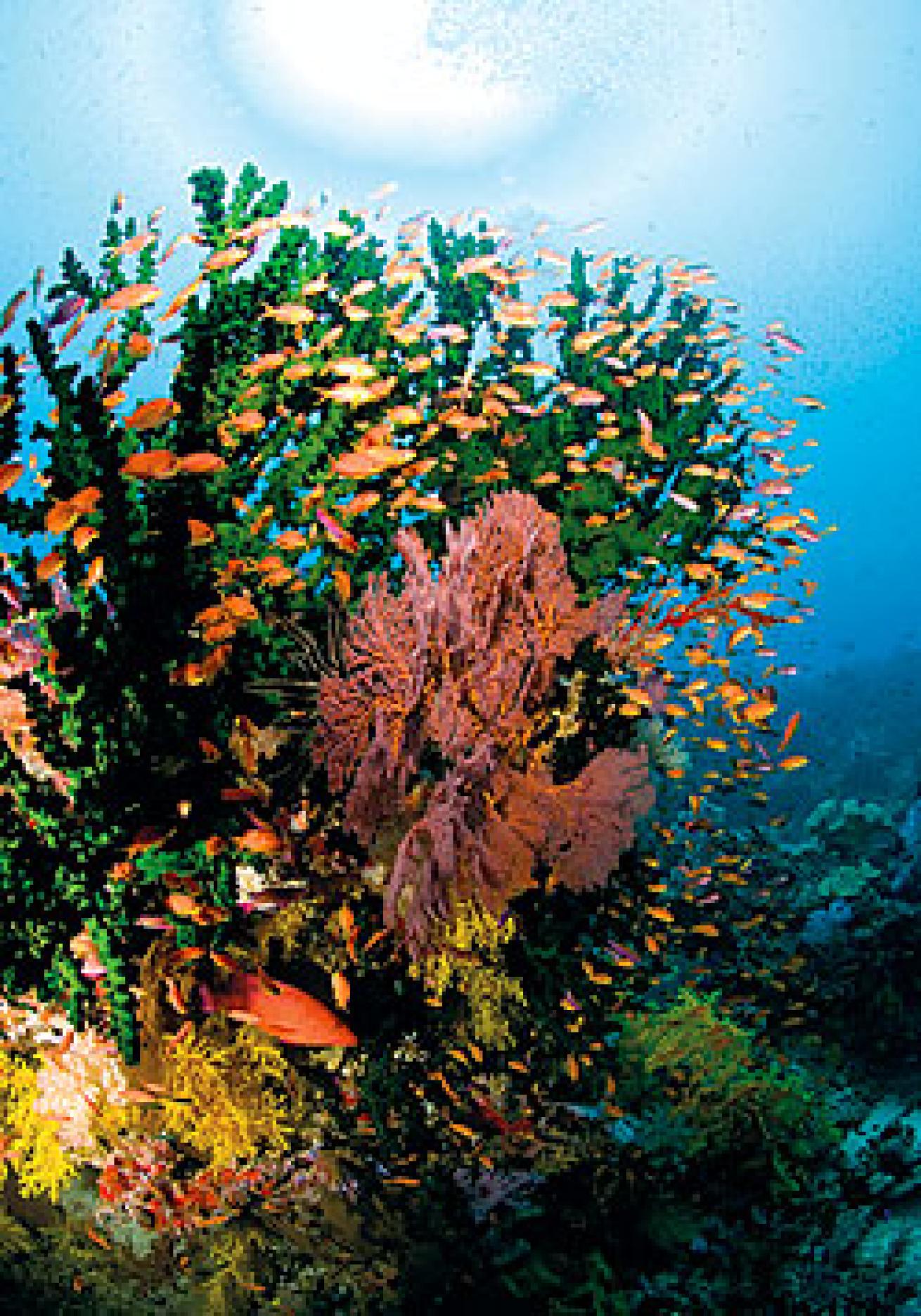 Some of the swiftest currents and lushest reefs can be found in the narrow Vatu-i-Ra Passage, where soft corals cling to pinnacles that reach toward the surface. Sites in the Vatu-i-Ra Passage are also covered with a kaleidoscopic array of hard corals, crinoids, anemones and seafans. Schooling surgeonfish, fusiliers, barracuda and trevally circle the seamounts while sharks patrol their blue perimeters. A constant presence on these reefs are clouds of anthias moving frenetically just above the corals. These loose collectives seem to be as organized as mosh pits, but each is actually comprised of several small "harems" with a strict social order that includes a dominant male, a few lesser males and a cluster of females and juveniles.