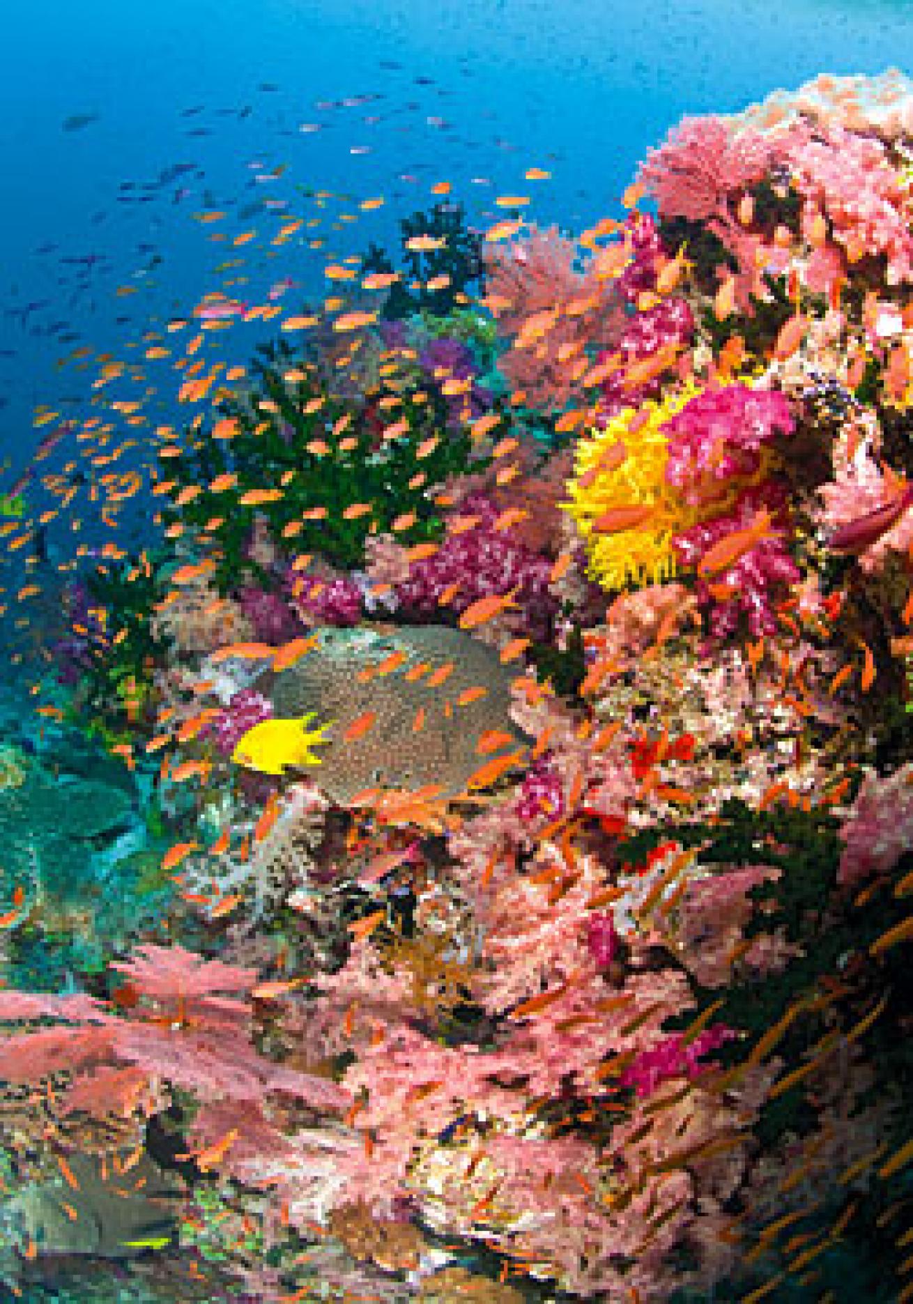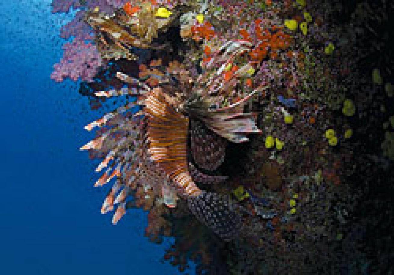Lomaiviti literally means "central Fiji," and the cluster of volcanic peaks east of Viti Levu includes the major inhabited islands of Makogai, Wakaya and Gau. All the islands are ringed by healthy barrier reefs thriving in what is best described as a "sweet spot" for healthy coral and fish life. Tidal currents intensify as they pass through the islands, keeping a steady flow of clean, nutrient-rich water flowing to the hard and soft corals, and also bringing in abundant fish and invertebrate life. It helps, too, that the islands are the first major reef system where coral and fish spawn, carried by trade currents across thousands of miles of tropical Pacific, settle and begin to grow.