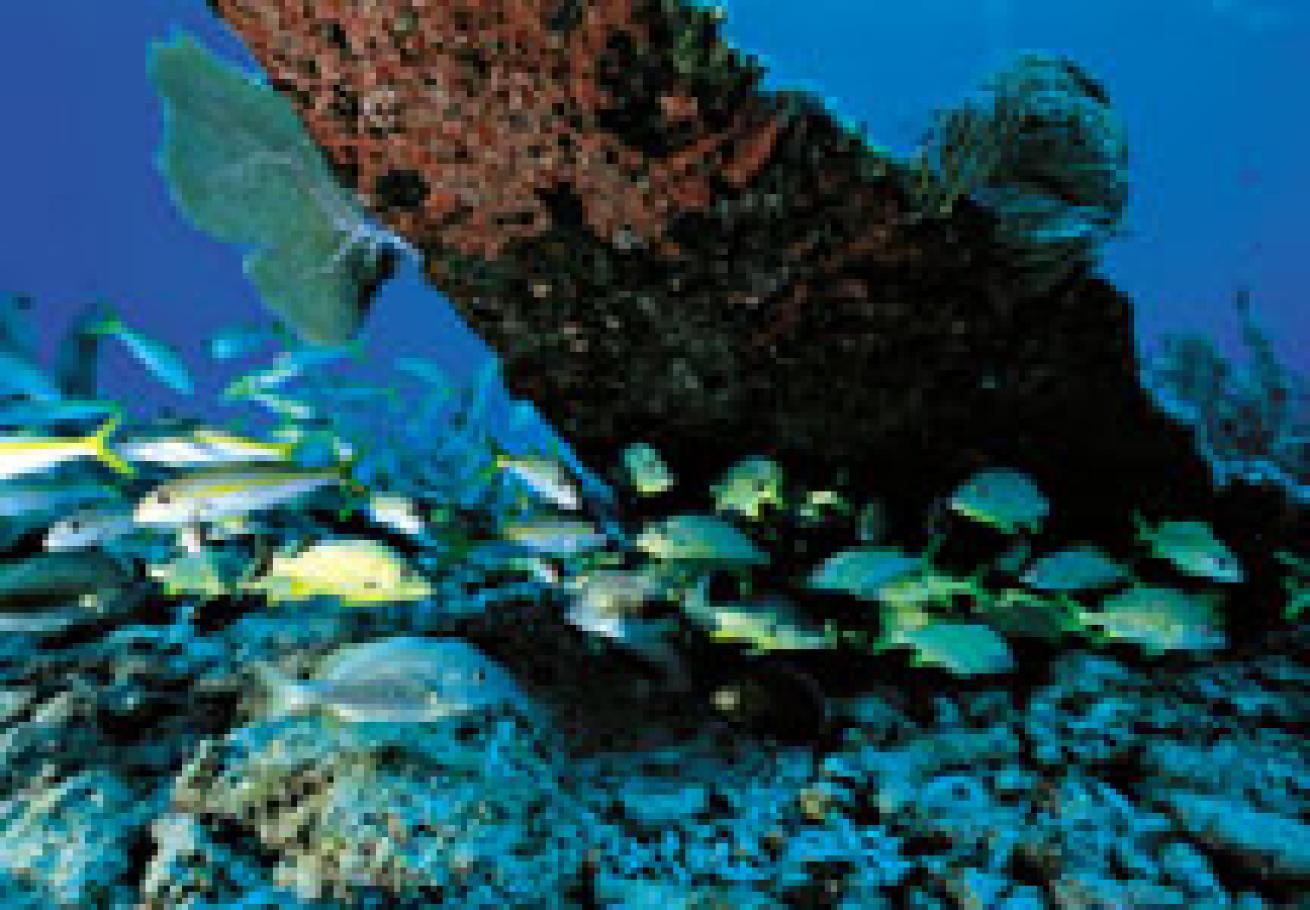 | The wreck of the Eagle sports profuse coral growth and fish life.|