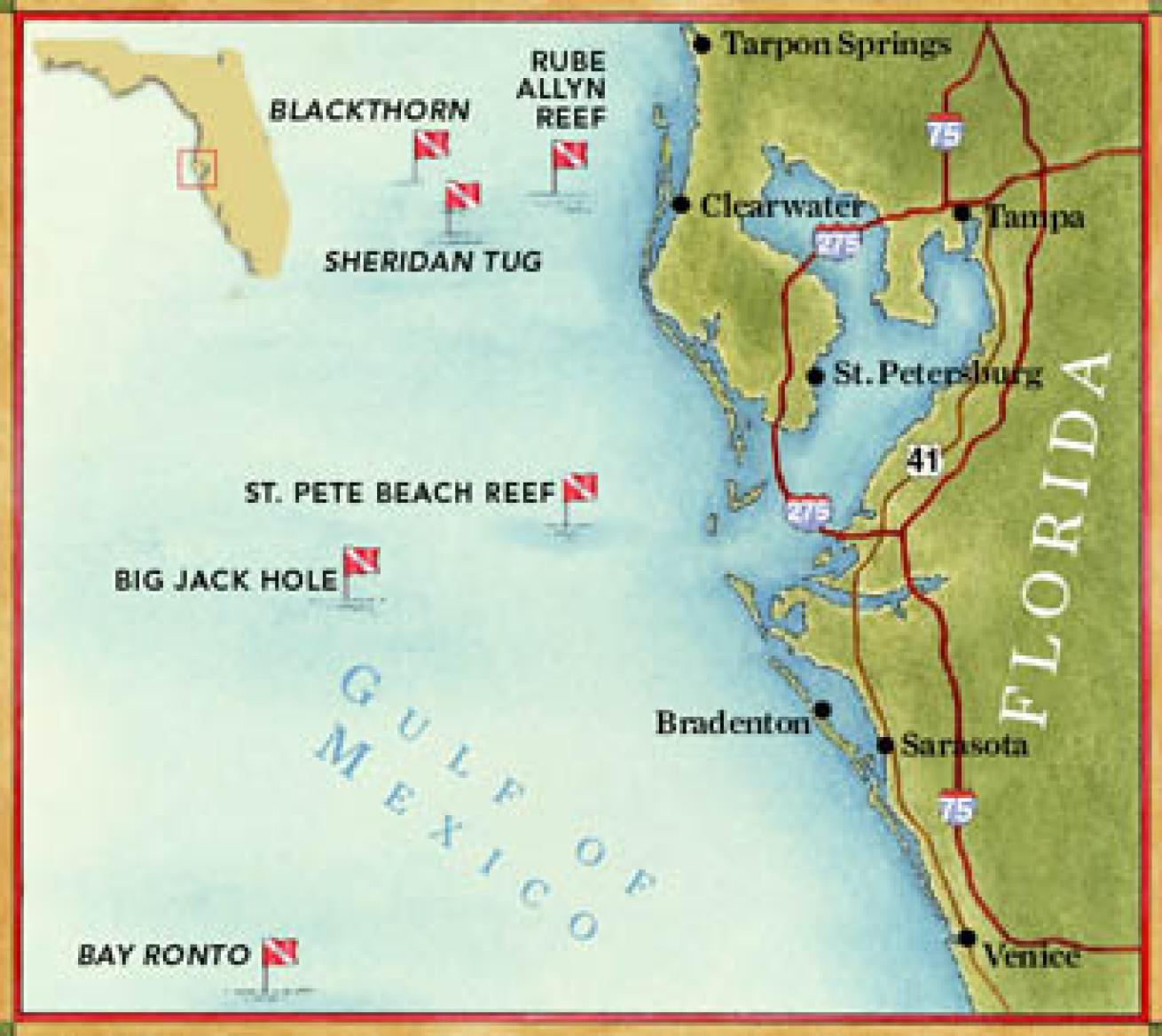 Tampa, St. Petersburg and Clearwater's hit parade includes the Rube Allyn Reef, which is an excellent place to look for kingfish that are attracted to the reef's tall pyramid structures and a 35-foot barge that sits atop concrete bridge pilings and light poles. The Sheridan Tug, a 180-foot-long ocean tug upright in 80 feet of water is 100 yards southeast of the Blackthorn, a 180-foot-long Coast Guard cutter, now broken in three pieces, resting in 80 feet of water. For a different venue try St. Pete Beach Reef, which is comprised of several Army tanks in about 35 feet of water and often features schools of large snook and other reef fish.