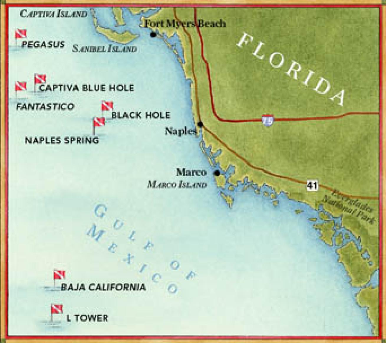 Anyone planning to dive this region for the first time should be aware that its marine geography is desert-like, broader and flatter than anywhere else in the state. To reach depths greater than 100 feet often requires runs as far as 40 miles off the coast. In addition, the few natural formations that exist on the bottom--mostly ledges--are usually miles apart. Consequently, most dive charters between Tampa in the north and Naples in the south are conducted from swift, 28- to 40-foot long-range craft, handling groups of six to 12 divers apiece.