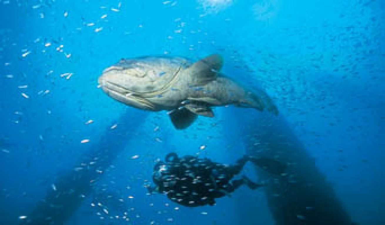 | |At L Tower, Goliath grouper patrol the structure's massive steel legs.|