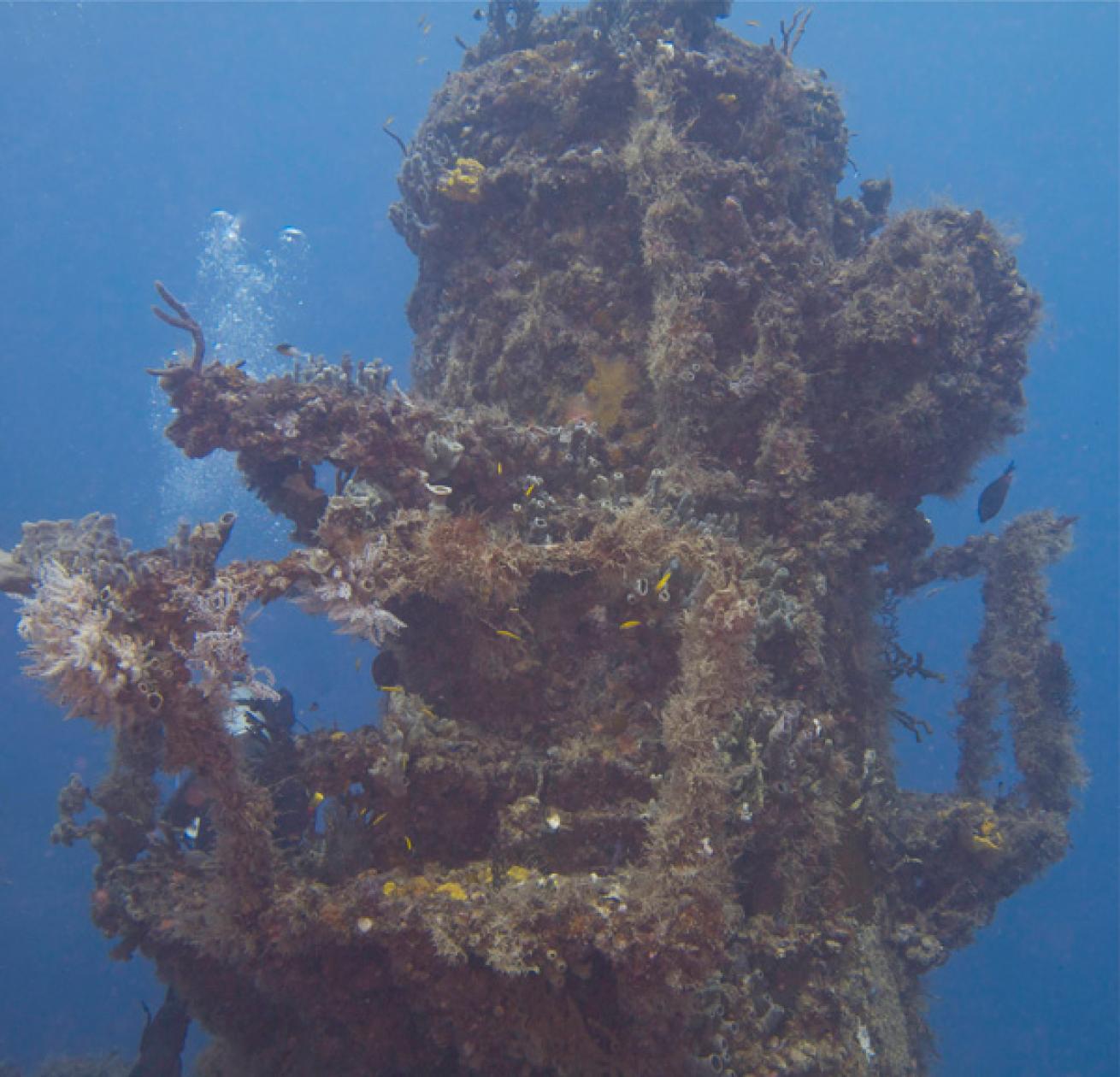 The bow of the vessel is a wide open space with the most prominent feature being the large double capstan anchor system, that is actually in use as the ship’s anchors and chain are placed out in front of the vessel to help keep it stabilized on the bottom. Moving aft, the superstructure rises up from the foredeck, with divers passing deck reels, numerous open hatches, and one coral encrusted twin 50 caliber gun mount as they ascend to the decks surrounding the Maneuvering Bridge. Rolling around to the port side of the superstructure, divers will find three bronze plaques commemorating the final duty station of the vessel and listing the names of significant donors to the project. Heading aft along the top weather decks at around 70 feet of depth, divers encounter the forward exhaust stack, two more coral-encrusted gun mounts, deck reels, and the control tower looking down into the open well deck from the back end of the main superstructure.