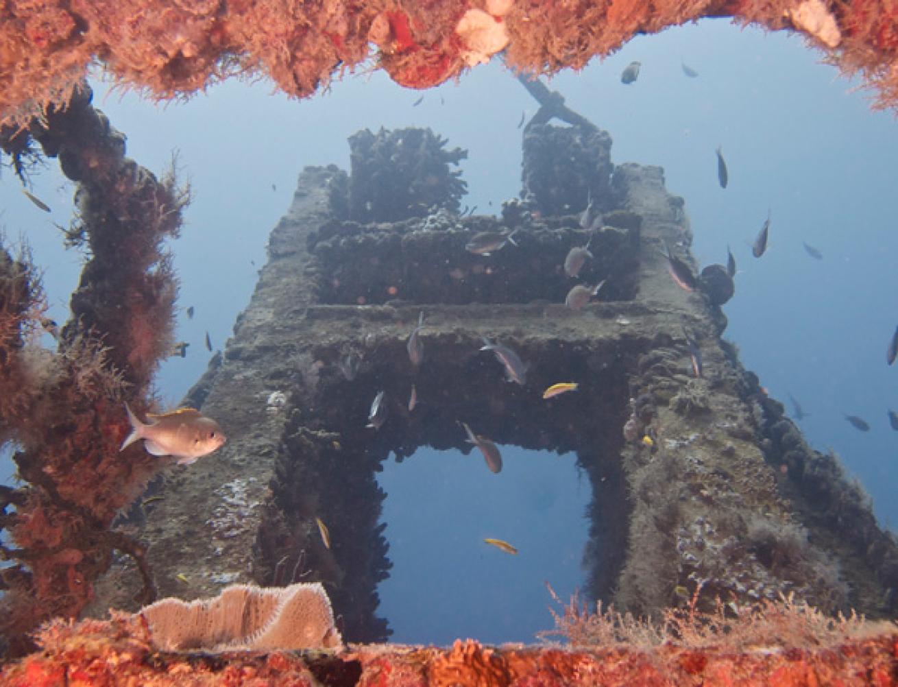 Moving aft into the well deck area, the most dominant structures are the aft exhaust stack on the port side, and the port and starboard 50-ton cranes, the lattice structures of which are heavily encrusted with coral and home to colorful reef fish. The large well deck is almost completely open at the top with just one section of the former helicopter platform remaining as a bridge between the port and starboard hull sides. Reaching the rear of the ship, the enormous well door lies open, as if waiting for landing craft to return onboard.