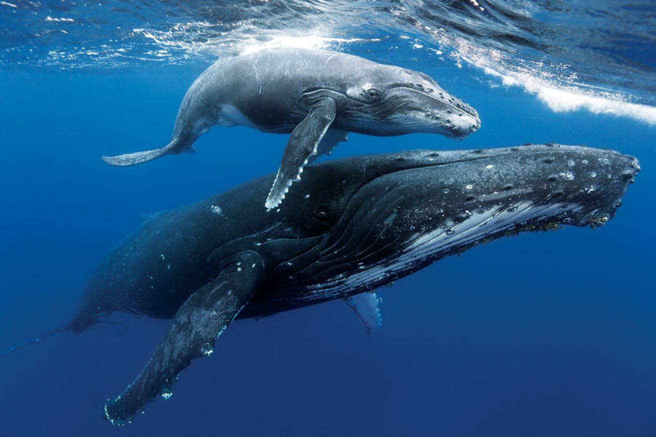 Vanessa MignonA humpback whale and calf swim close to the surface in the islands of Tonga.