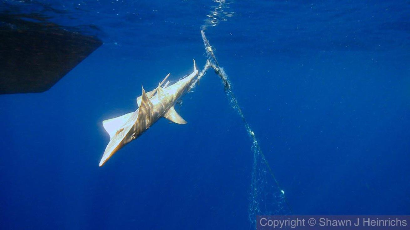 Yard after yard of gillnet rolled up the side of the boat. The lifeless carcass of grey reef shark broke the surface and was hoisted aboard. It was clear that this shark had struggled for a long time and had ultimately died from suffocation. Several more lifeless reef sharks were hauled aboard and our hope of rescuing sharks turned to despair. Then the dark shape of a large guitar ray appeared and realizing it was still alive, we raced to free it. The team hoisted the massive ray aboard the boat, untangled it and released it. This rescued effort was followed by the successful release of a bow-mouth ray, another guitar ray, a wobbegong shark, and a pelagic stingray or two. All in all, we freed and released a half-dozen live animals.