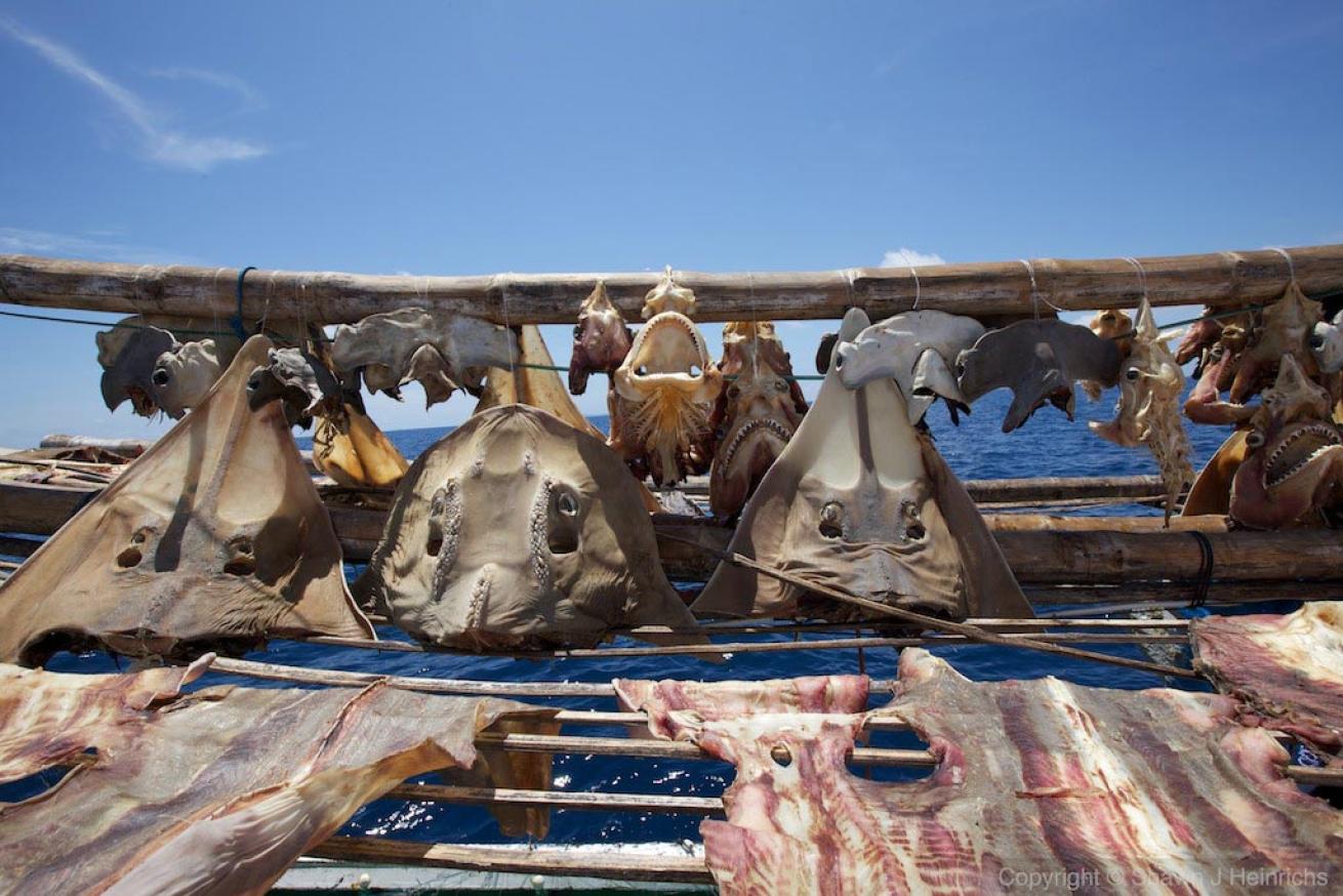 This April, I returned to Raja Ampat with a team of manta researchers and my investigative teammate Paul Hilton. Early one morning while in route to the manta site, we observed a suspicious boat in the corridor. After radioing the Ranger Patrol we approached the boat and boarded it. On the roof of the boat, the disembodied heads of almost two-dozen scalloped hammerheads, a dozen grey reef sharks, and a dozen guitar rays and bow guitar mouth rays. Most disturbingly, the lifeless bodies of several mature grey reef sharks and a large guitar ray were piled on the front. Our captain informed the captain of the shark boat that he was illegally fishing sharks and rays (Raja Ampat is now a Shark and Ray Sanctuary) and that he must cease and leave the area immediately. Sadly, once these nets are in the water, the damage from gill nets is unavoidable.