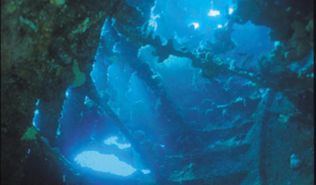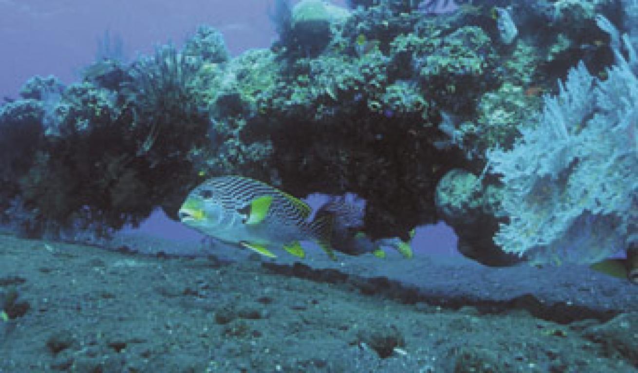 Instead of visiting the resort's house reef straight off, we opt to venture a little farther up the beach to Tulamben Bay's other big attraction. This is the wreck of the Liberty, a WWI-era cargo freighter that was torpedoed by the Japanese in 1942. Her allied escorts couldn't get her to Singaraja for repairs, but did manage to beach her in the shallows of Tulamben Bay. There she sat for more than two decades. It was the 1963 volcanic eruption that literally shook, rattled and rolled the wreck into deeper water. Now she sits, more or less intact, in about 95 feet of water. The top of the wreck is only 10 feet from the surface, and if Liberty weren't a mere 100 feet from the beach, she would surely be a hazard to navigation.