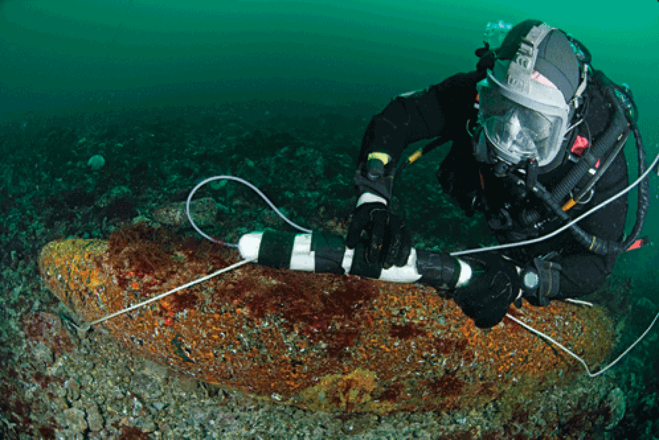 I’m sucking gas through the regulator, wheezing like a 40-a-day, tar-in-the-arteries smoker. Trying to keep up with a fit Royal Navy clearance diver like Yorkie Haran is futile, but he’s stopped finning to inspect something. It’s a 500-pound bomb, and 20 feet away I can see a second rusting bomb on the seabed. I’m surrounded by high explosives deep inside a NATO bombing range. Dropped at supersonic speeds, the bombs didn’t detonate but have spent time quietly rusting under the waves. My breathing slows but the adrenaline still flows, my heart pounding under my drysuit. I wonder how the fuse has taken to salt water. Haran pokes around the rear of the bomb, looking for the fuse, and gives me the thumbs up. It’s live ordnance. The bomb is marked, and we head to the surface. The search phase is over; it’s demolition time. One hour later I’m back alongside the bomb with a second clearance diver, John Anderson, and he’s carrying a 4-pound pack of plastic explosive –– known in Royal Navy-speak as “Bang.” The Navy believes there are few problems in the world that plastic explosives can’t solve, and underwater bomb disposal isn’t a subtle “Red or blue?” wire-cutting exercise or ticking-clock fuse removal. The Bang is strapped to the casing of the bomb, and I click away with the camera, relaxed in the knowledge that if anything goes wrong now, my passing will be both quick and painless. Anderson is relaxed but not careless, posing for a photo as he rests his folded arms on the explosive. This isn’t leisure diving, and 12 minutes after leaving the surface, I’m back on the boat. The detonators are readied, and with fuses burning, we motor away. Five minutes later there’s a dull whump, followed by a 150-foot plume of seawater. The seagulls wheel in, squawking and screeching as they scoop up the fish brought to the surface by the explosion. It’s just like fireworks on the Fourth of July, performed on a military scale, and I can’t help grinning like a kid.