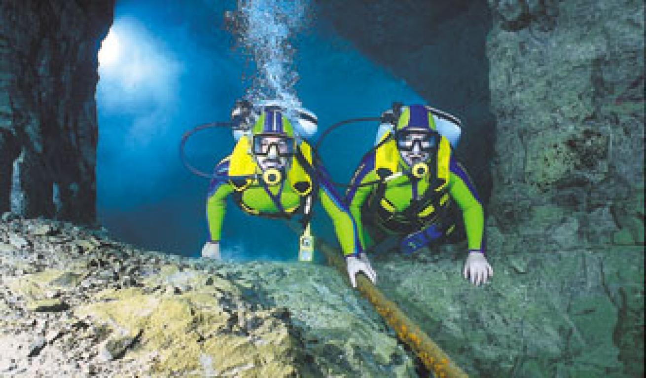 While halogen lights simulate the open water experience, subterranean diving is not for everyone. The water is clear (60 to 100 feet of visibility), but chilly (55 degrees year-round). Only the guides are allowed lights in order to discourage freelance exploring. Because of the cold water, artificial light and cavern/cave conditions, this is an advanced dive for competent divers only.