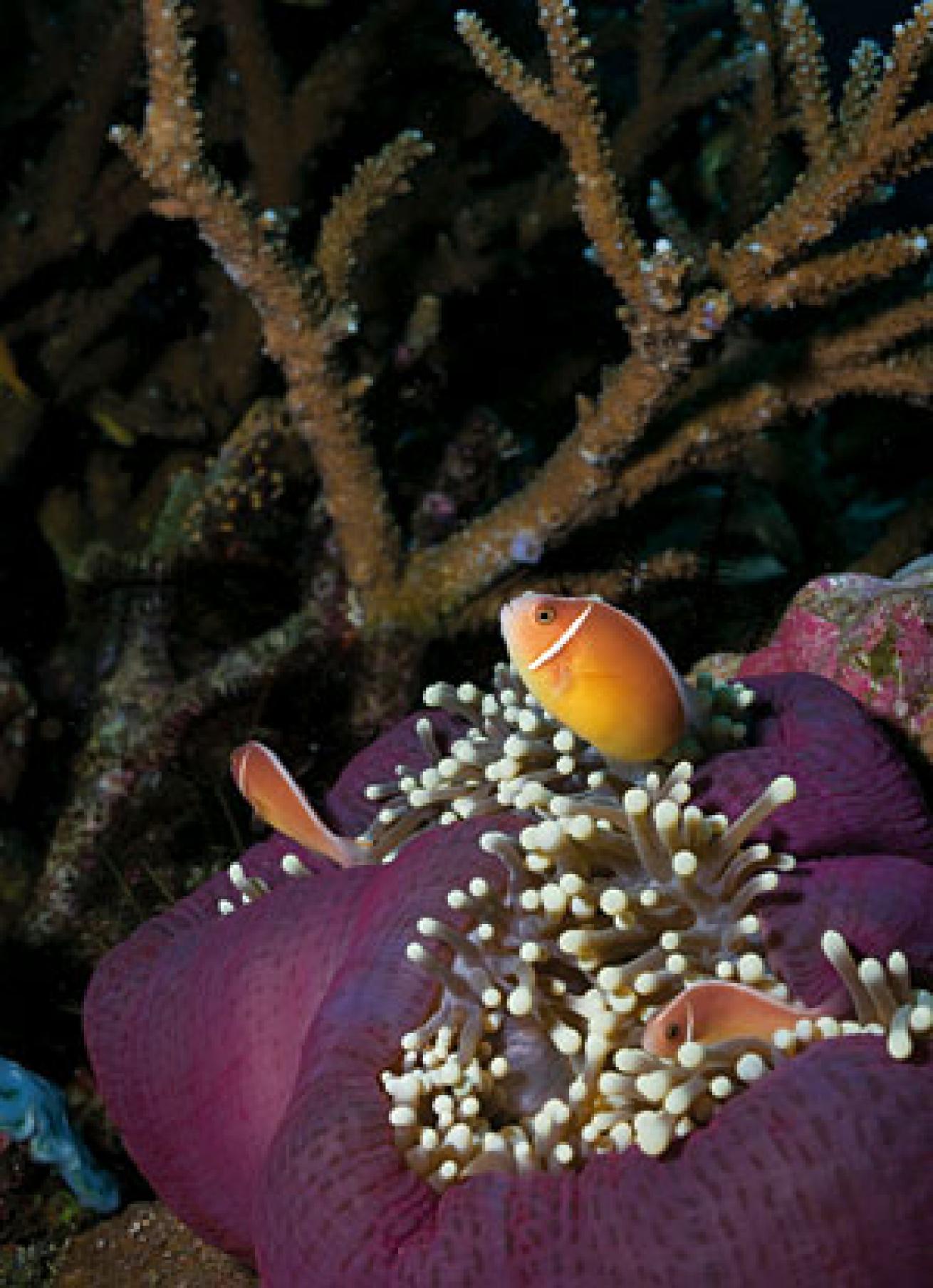 Cherie's Reef, Tania's Reef and Crinoid City are among the most spectacular sites. They're distinctly different and are all in close proximity. They top out at about 20 to 25 feet with a broad expanse of hard coral punctuated by anemones, clownfish and massive clouds of anthias. Each features a semi-vertical wall decorated with brilliant soft corals. However, the reef dwellers are dramatically different. At Crinoid City, we spot a resident rhinopias and an epaulet shark endemic to the Milne Bay region, as well as octopus, a resident school of jacks and for some reason, extraordinarily tolerant angelfish. At Cherie's Reef, the stars are two different species of pygmies on seafans at reasonable depths (one at 72 feet, the other at only 36 feet), a multitude of cleaning stations visited by coral groupers and sweetlips; and clownfish, hawkfish and all manner of small butterflyfish that pack the reef shallows.