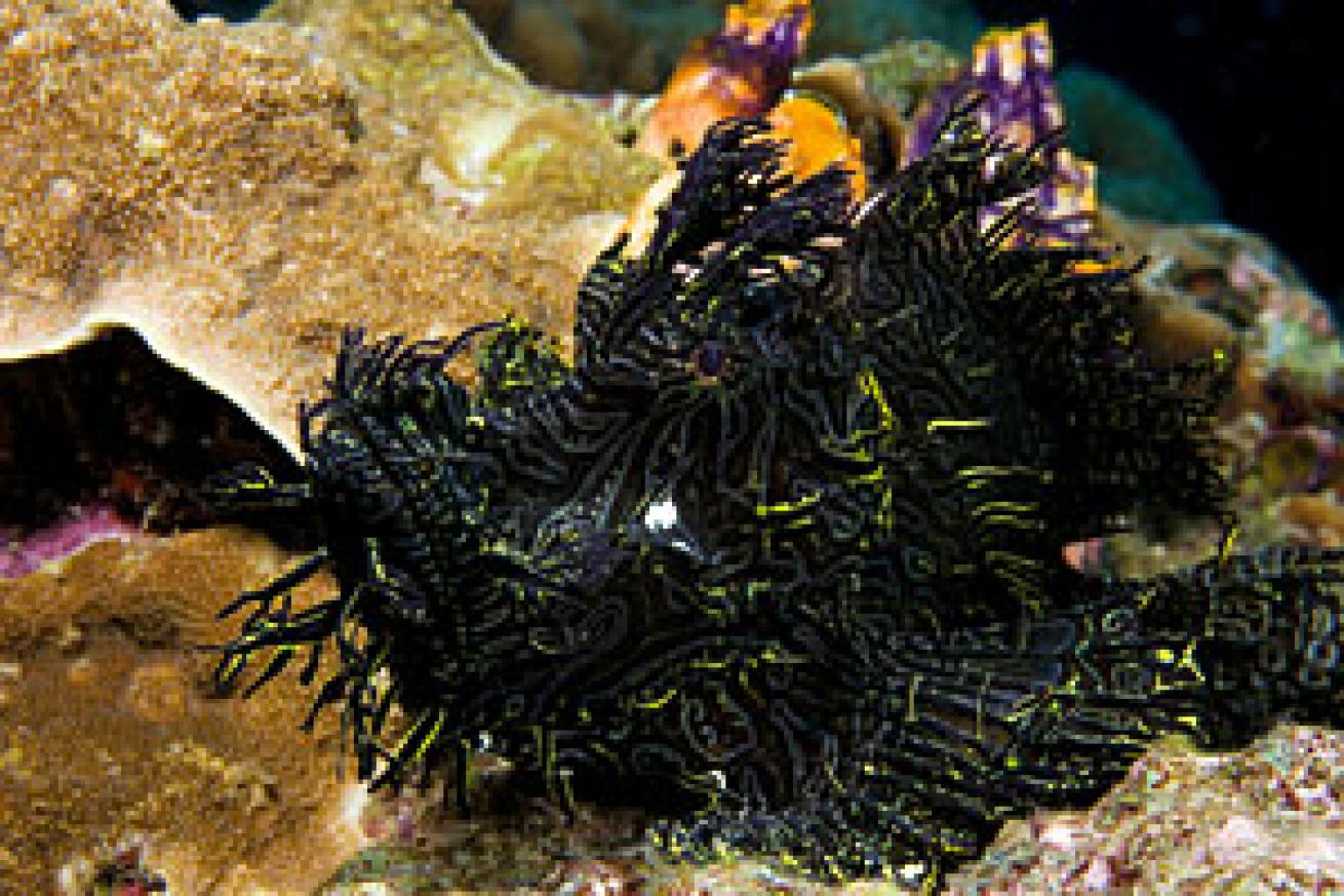 The most fun encounters at Lauadi are with smaller sand-dwellers. Tiny shrimp live symbiotically beneath sea cucumbers; seahorses curl around tiny bits of sponge; mantis shrimp lurk in sandy lairs, waiting to ambush hapless passing prey; and harlequin ghost pipefish pretend to be part of the nearby crinoids. There are also vibrantly decorated, flamboyant cuttlefish the size of the end of your thumb--far different from their larger-sized cousins.