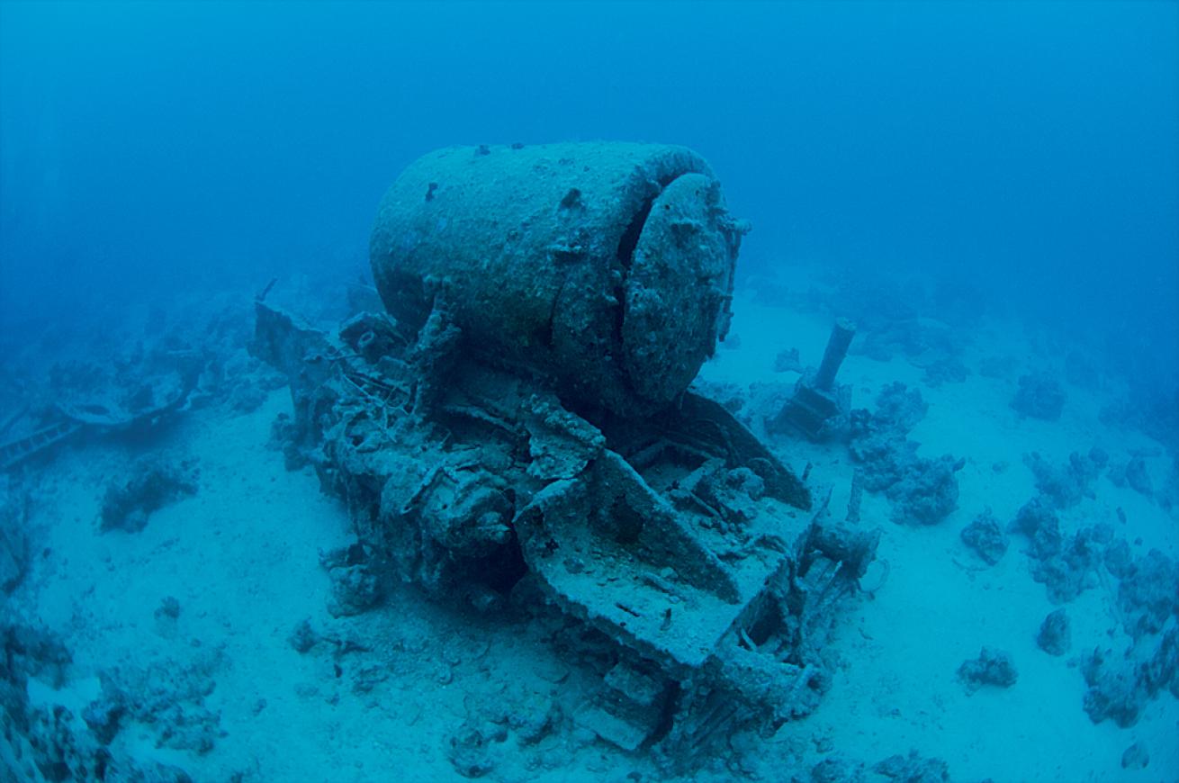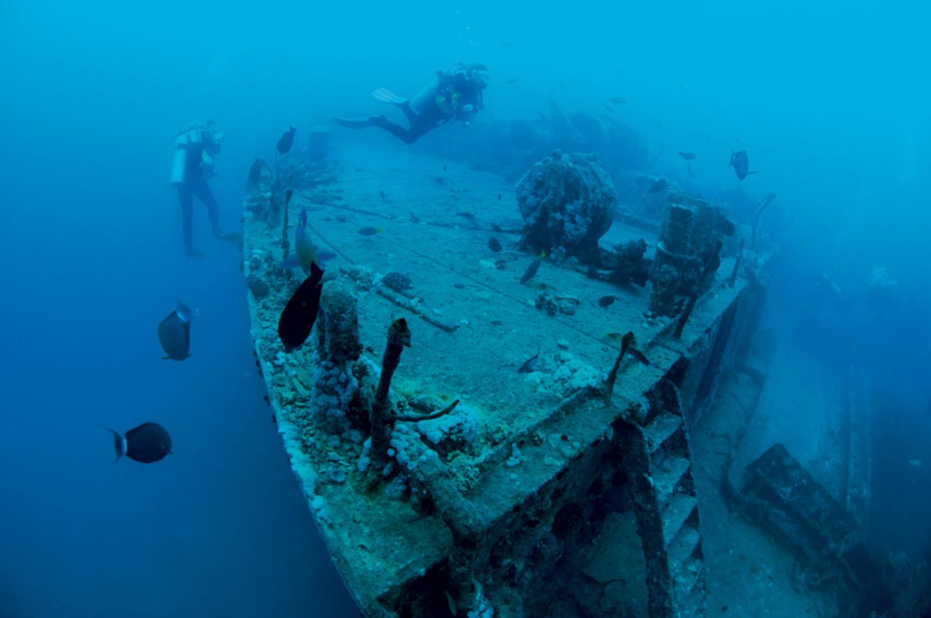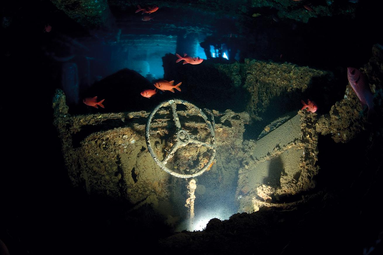 Start with a deep dive around the stern and then explore the exterior of the wreck. The stern section rests on its port side, which makes the huge propeller and rudder near the seafloor must-see features. Along your way around the back end, you’ll pass anti-aircraft guns before reaching the bombed out area. Spend a few minutes here exploring the debris field — a keen eye can spot a wide variety of loose artifacts. From here ascend to the shallower depths at the top of the superstructure. Make light penetrations into the captain’s cabin and bridge before swimming along the top deck, which still sports railcars, a torpedo, davits, masts and winches.