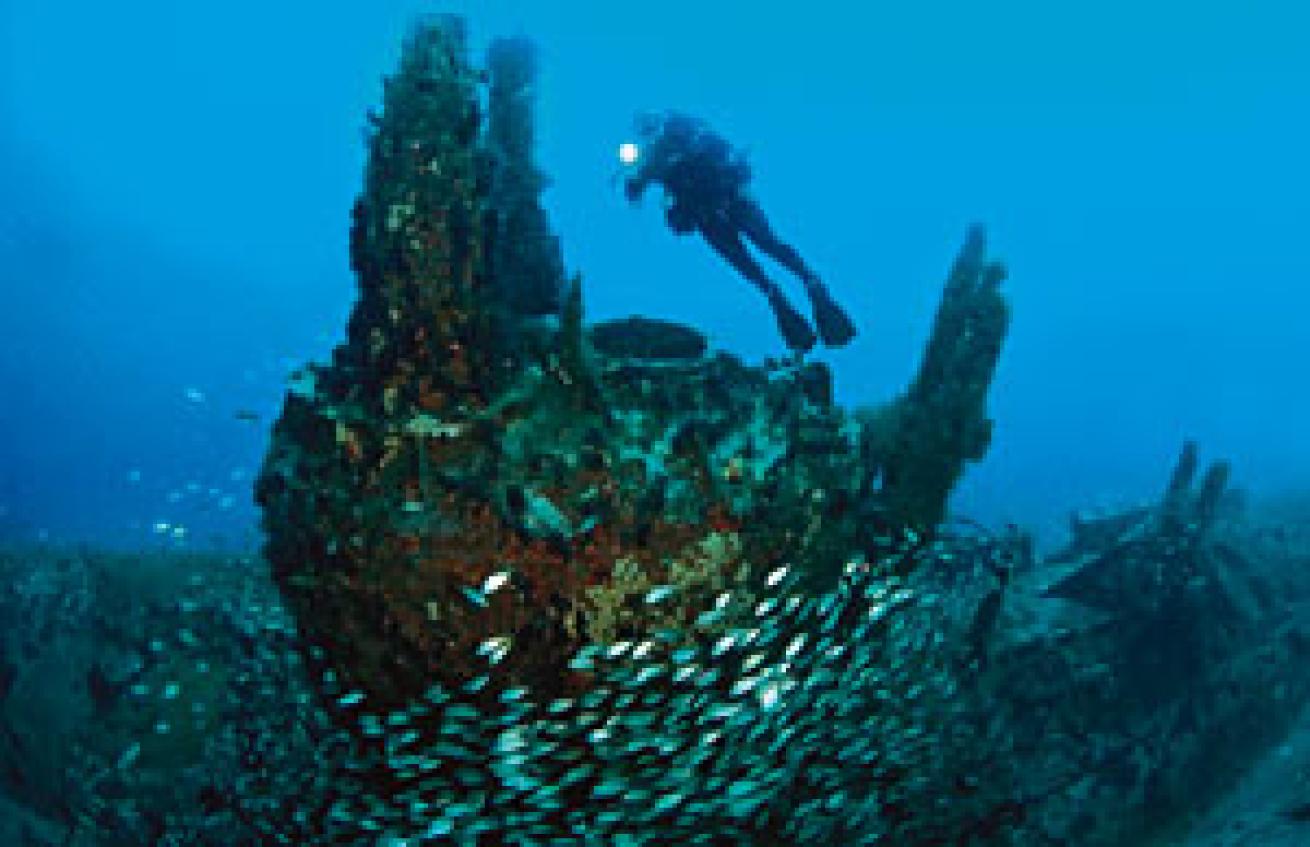 Finally, Midnight Express begins its two-hour journey to the most requested vessel in North Carolina's wreck portfolio--the German unterseeboot, or submarine, U-352. Our boat slices across Bogue Sound and out through Beaufort Inlet, and I daydream of diving new wrecks that lie undiscovered beneath our moving hull. As I don my wetsuit in anxious anticipation for the day's dives, I look around the deck and quickly realize this isn't your average recreational dive boat atmosphere; everyone else around me has techie accoutrements--backplates and wings, double 80s, rebreathers and even spearguns. I'm not in Cayman anymore, Toto. This collection of sunken ships, including the following trio, attracts wreck divers from up and down the East Coast. And if wreck diving is a religion, the U-352 is among its sacred temples.