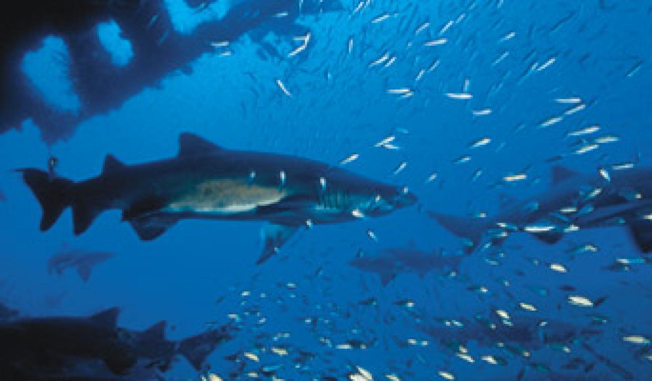 Blown apart by a U-boat torpedo in 1942, the tanker Papoose lies upside down on the sandy ocean floor, broken into sections. You can spend several dives just exploring the wreckage, but most divers get distracted early by the big sand tiger sharks that call the wreck home. Their size and rows of jagged teeth give these sharks a ferocious appearance, but they are generally docile. Their reaction to divers is often one of curiosity, and their mellow demeanor means you can get close for the pictures of a lifetime. Look for them on the wreck, which rises to 90 feet in spots, or on the sand at 120.