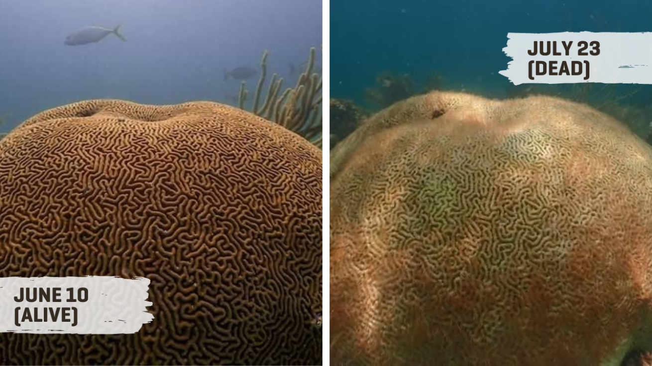 A Colpophyllia natans colony on June 10 and July 23. The coral is already dead, and algae (fuzzy brown, yellow) has started to grow over the skeleton. The soft coral growing behind it on the right is full and healthy in the before shot and withered away, dead in the after.
