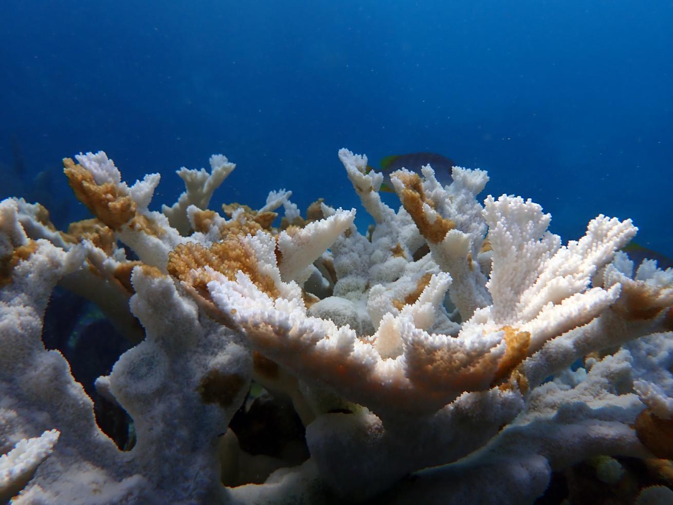 A dead elkhorn coral on Sombrero Reef has white (bleached) and orange (tissue slough, which is dead coral tissue killed by the heat).