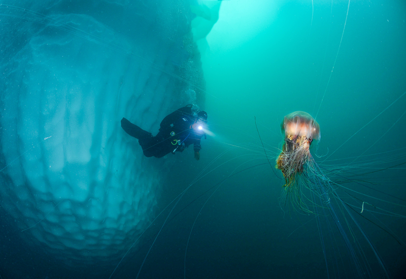 That was a pretty incredible experience, almost a spiritual experience. I would take off the mask I’d worn down and hand it to Luca, who was nearby with the other safety divers. And I would turn to face the iceberg. All I would see is pitch black around the iceberg and this big white object in front of me. It was reflecting the light in all of these cool ways. And even though I didn't have a mask, I could make out the features of the ice perfectly, and know exactly where I had to go on it.