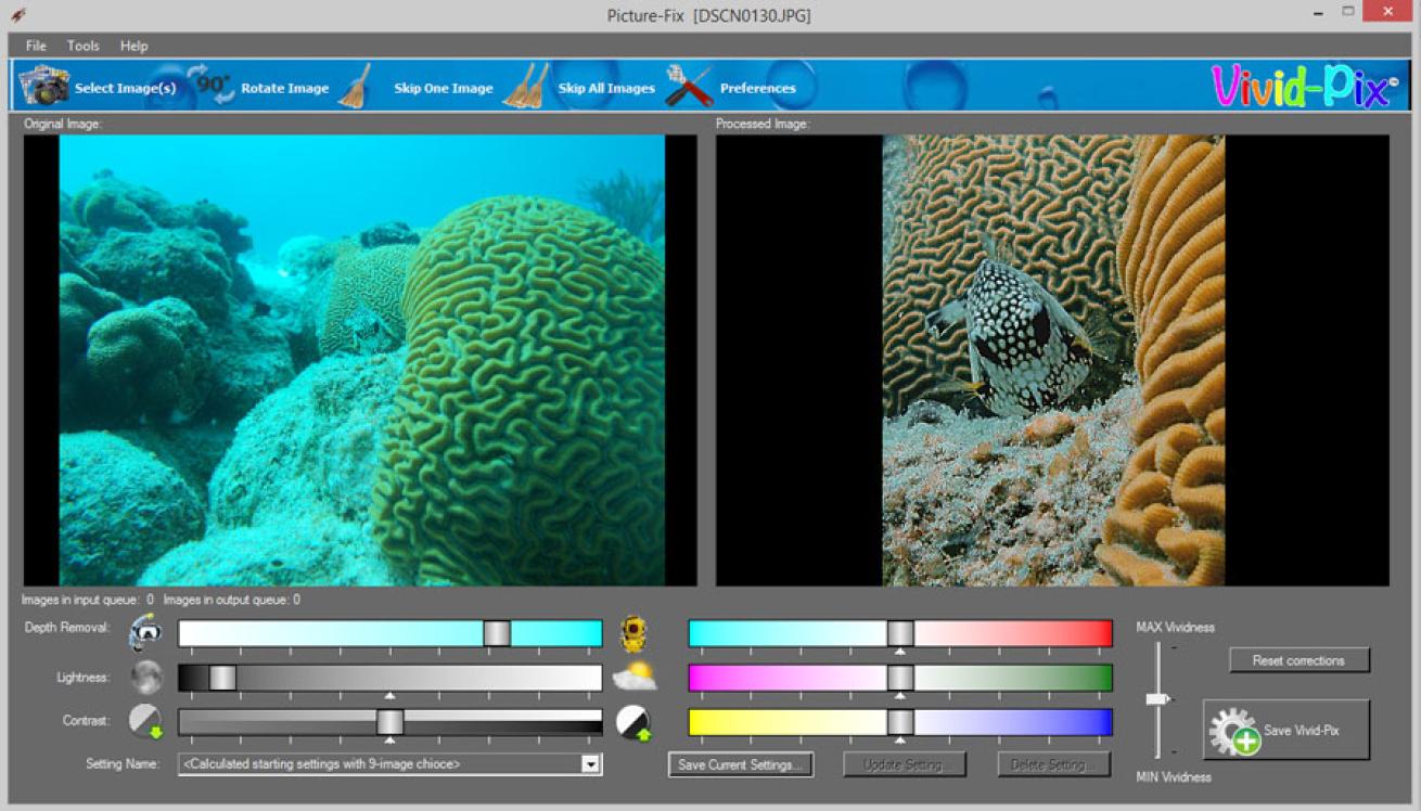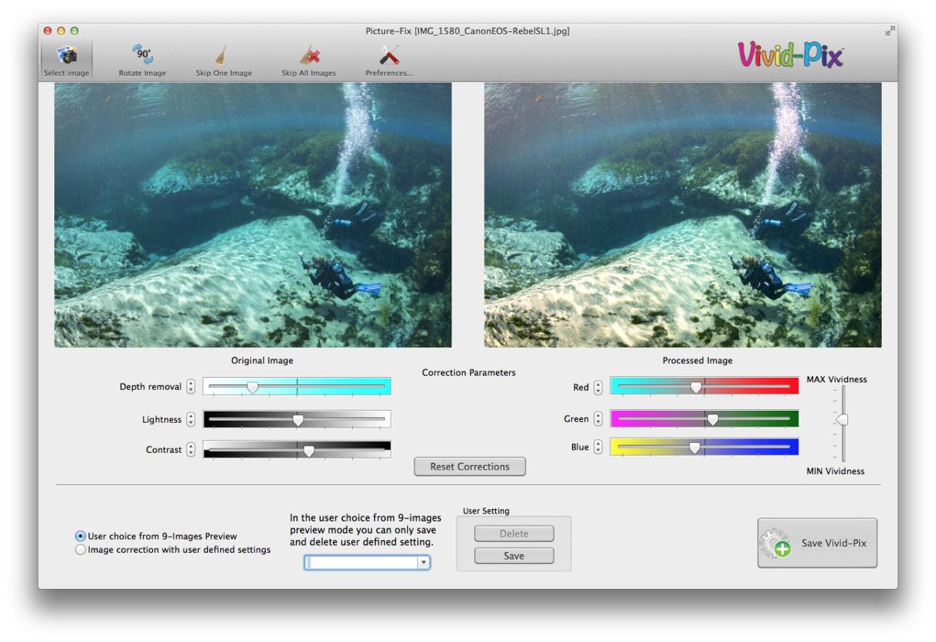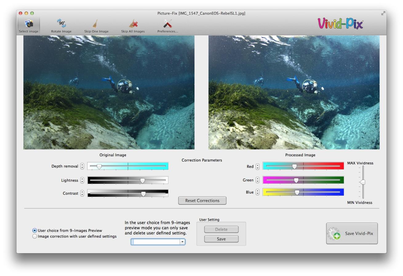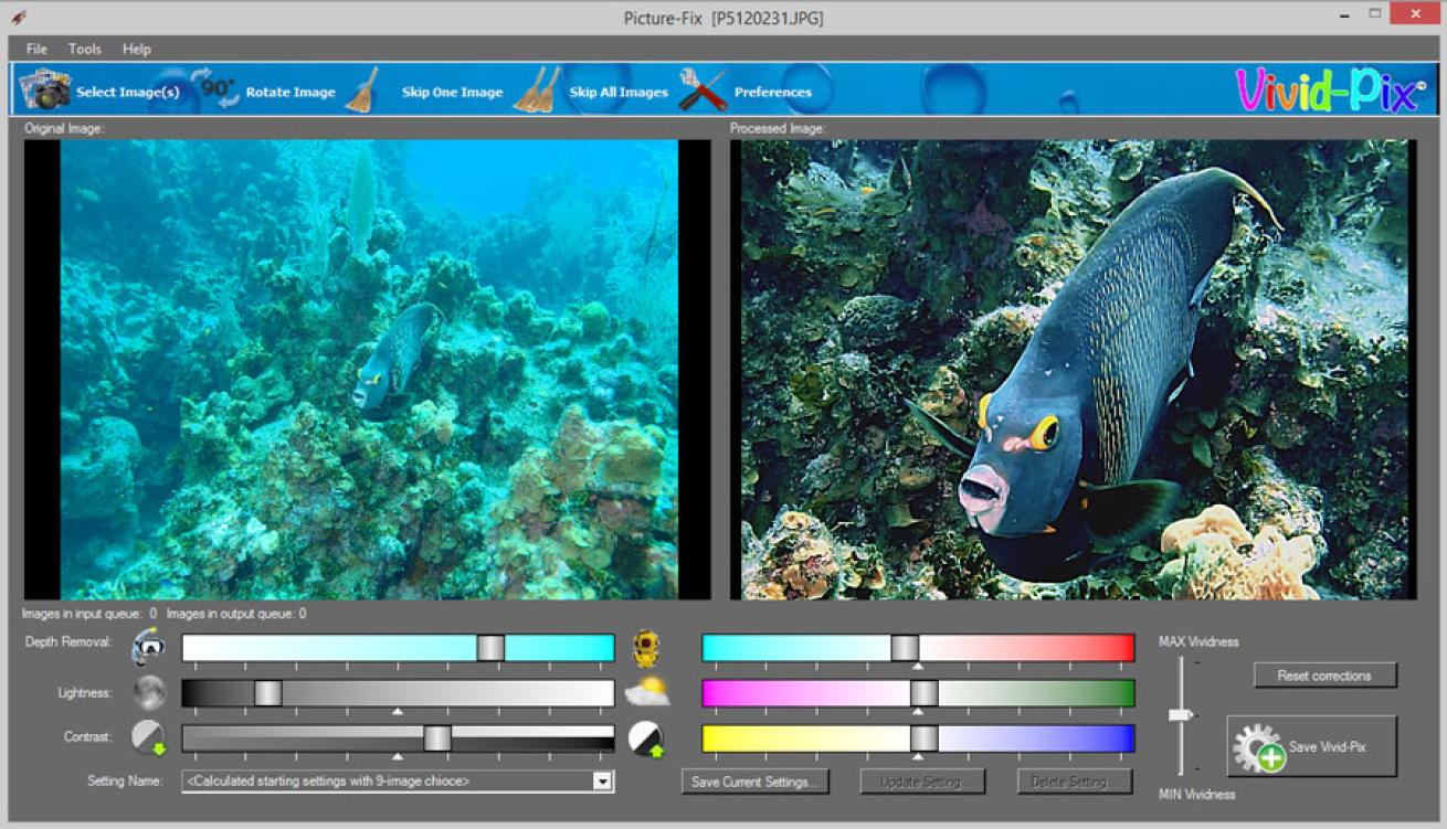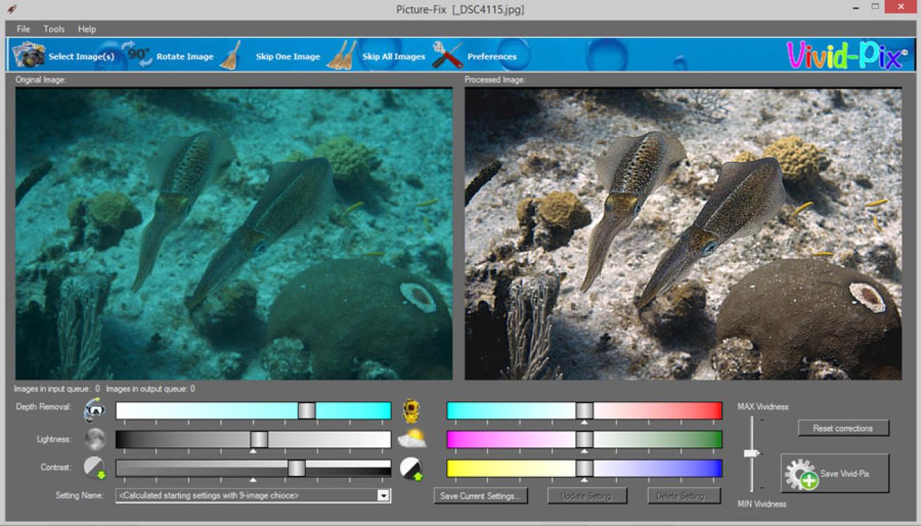 As you can see from the screenshots of the application window, Vivid-Pix gives you a series of adjustments to help bring out the best of your underwater photos. You can choose from a variety of sliders to modify the image: Depth removal, Lightness, Contrast, Red/Green/Blue and a Vividness (Saturation) slider as well. Options to save your settings to use on multiple photos in a gallery (batch processing), as well as basic image rotation and cropping features also exist.