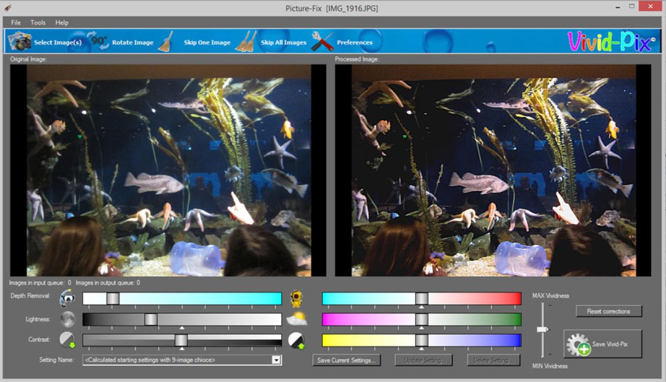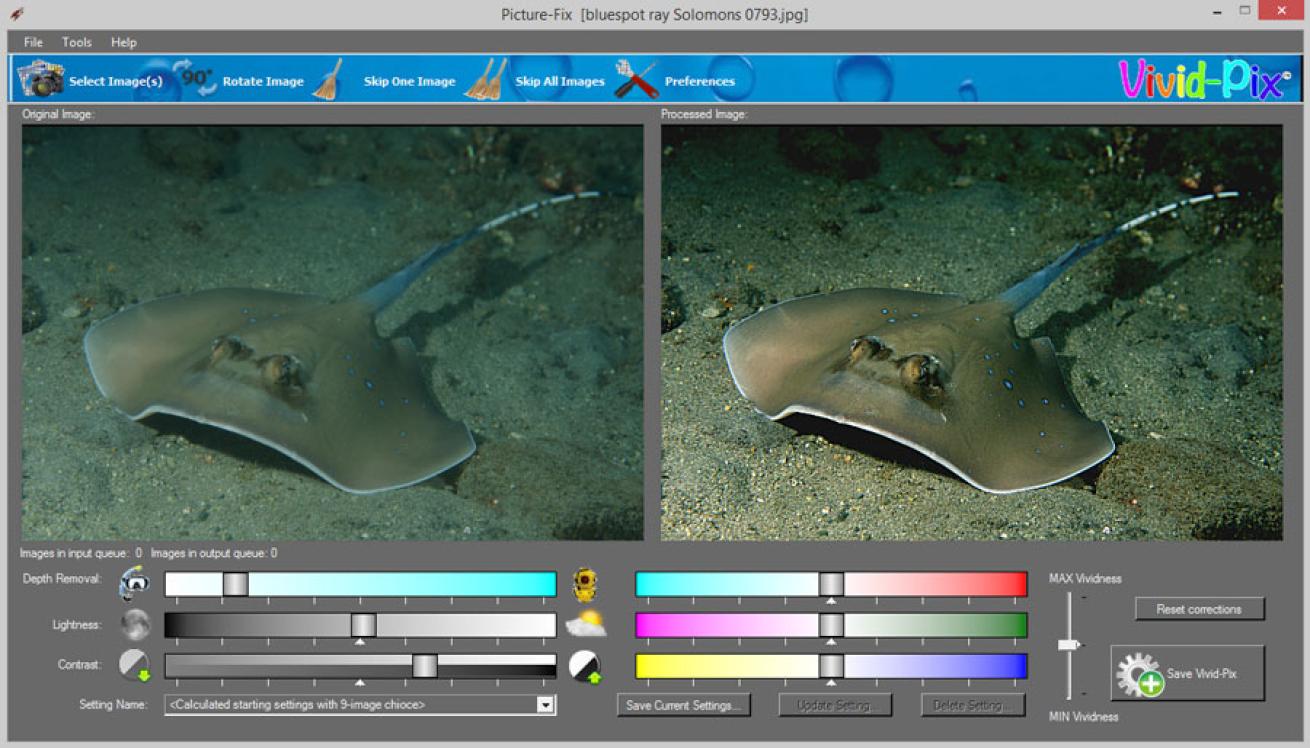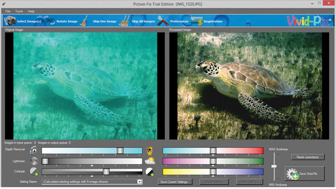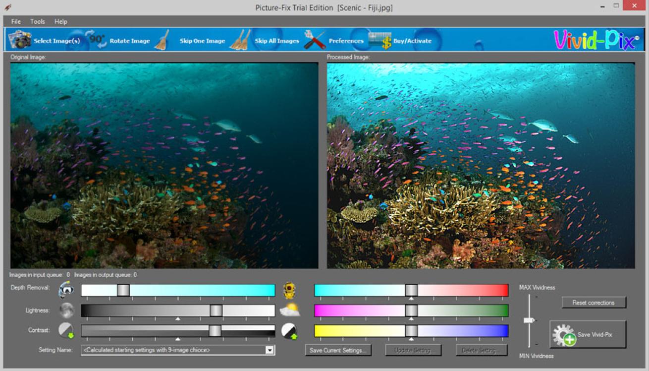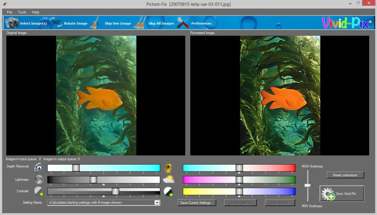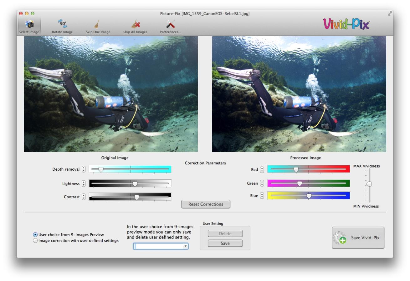 As you can see from the screenshots of the application window, Vivid-Pix gives you a series of adjustments to help bring out the best of your underwater photos. You can choose from a variety of sliders to modify the image: Depth removal, Lightness, Contrast, Red/Green/Blue and a Vividness (Saturation) slider as well. Options to save your settings to use on multiple photos in a gallery (batch processing), as well as basic image rotation and cropping features also exist.