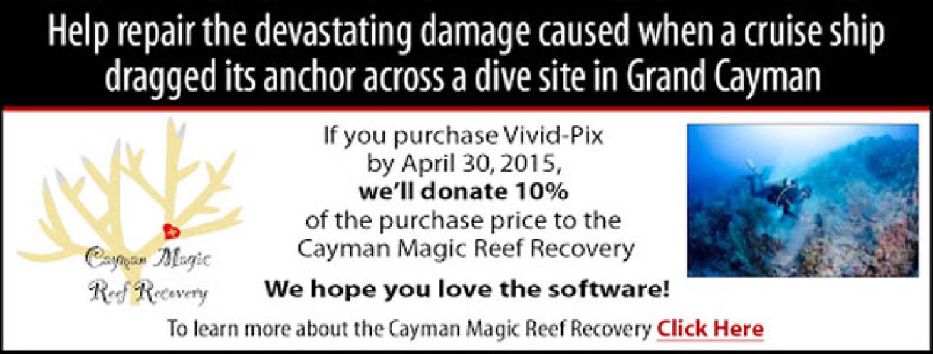Vivid-Pix is currently holding a photo contest on Facebook to raise money for the Cayman Magic Reef Recovery project. With each picture that is submitted, they are making donations to restore the damage to a Grand Cayman dive site from a cruise ship anchor. It’s FREE to try the software and enter the contest. Plus, you get a chance to win a signed photograph by renowned photographer Marty Snyderman — visit the Restore a Picture, Restore a Reef photo contest: https://www.facebook.com/Vividpixfix/app_292725327421649