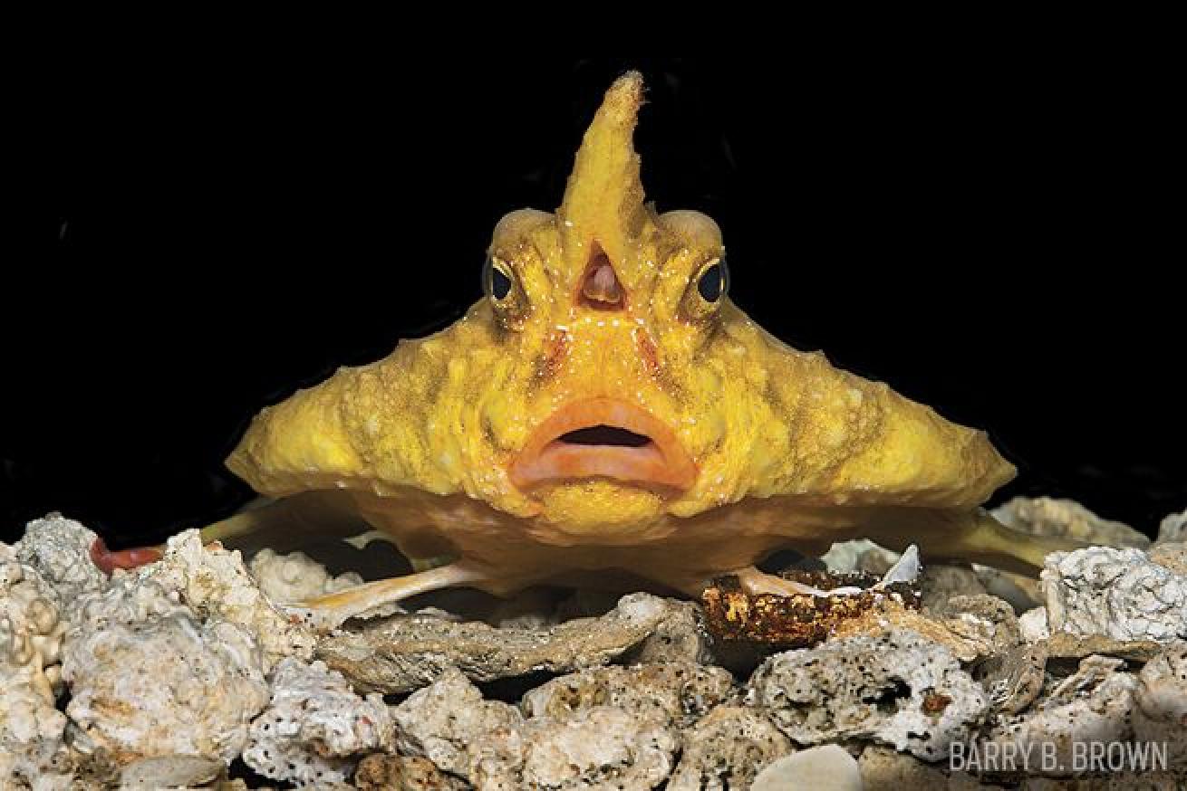 Many walking fishes, including frogfishes and scorpionfishes, share the common trait of having lost their swim bladders. Much like a diver’s BC, the swim bladder is the buoyancy device of the swimming fish to which it adds and removes air to maintain neutral buoyancy.
