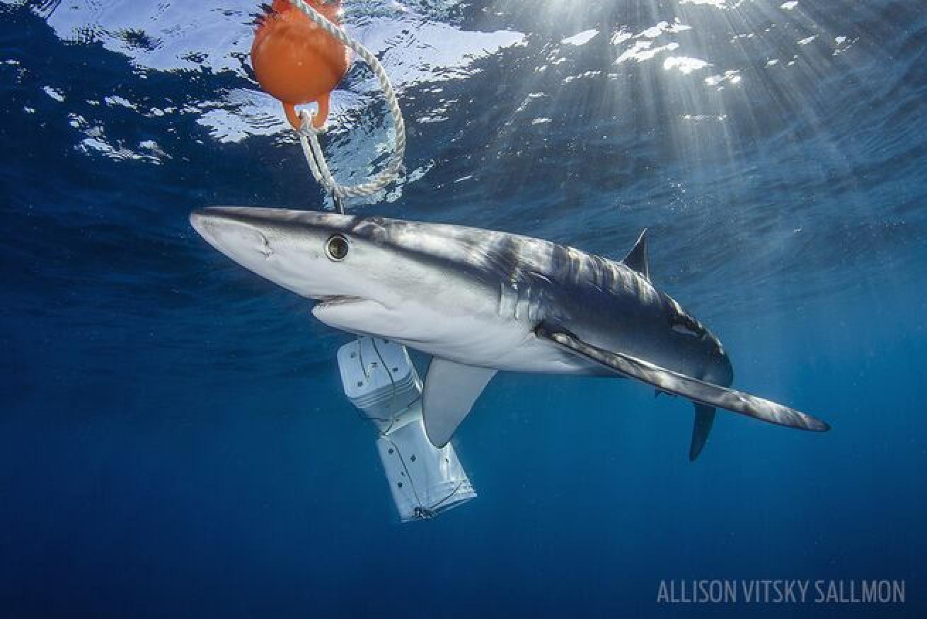 Allison Vitsky SallmonA blue shark swims in close to investigate buckets of bait placed off the coast of California.