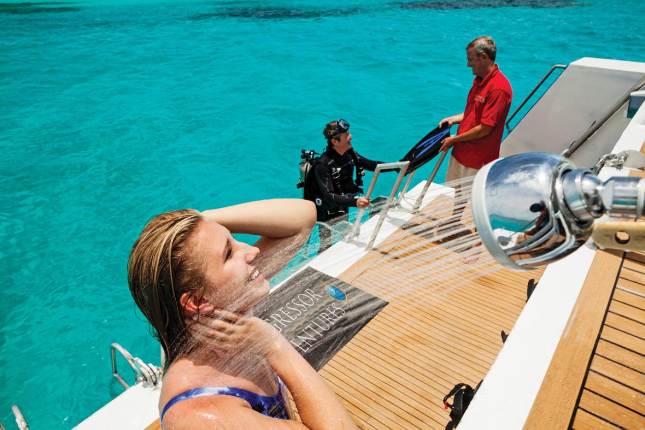 Courtesy AggressorThe dive deck of Bahamas Aggressor has freshwater showers to rinse off after diving.