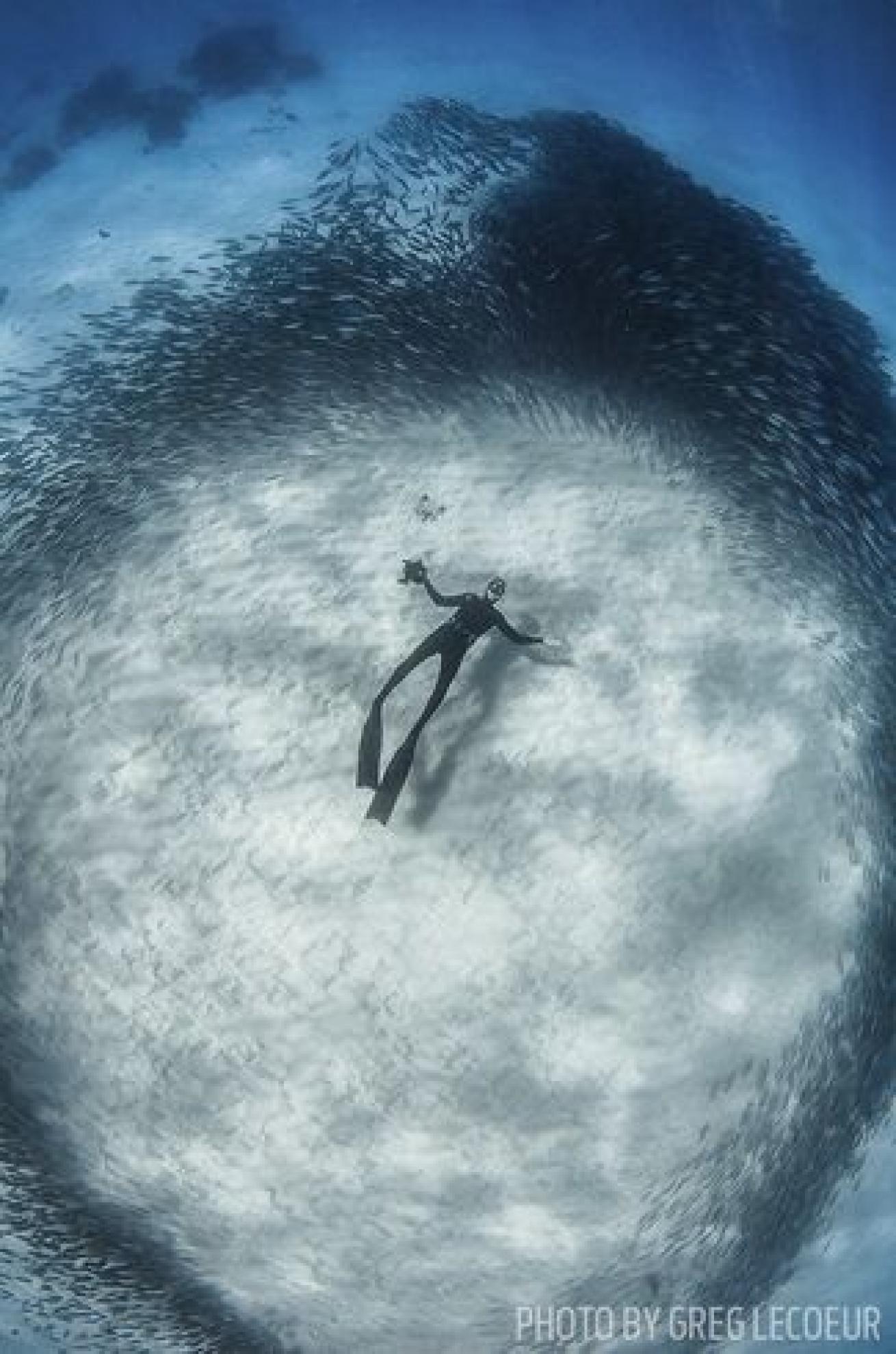 Greg LecoeurA school of bigeye scad surround freediver Deron Verbeck off Kona, Hawaii
