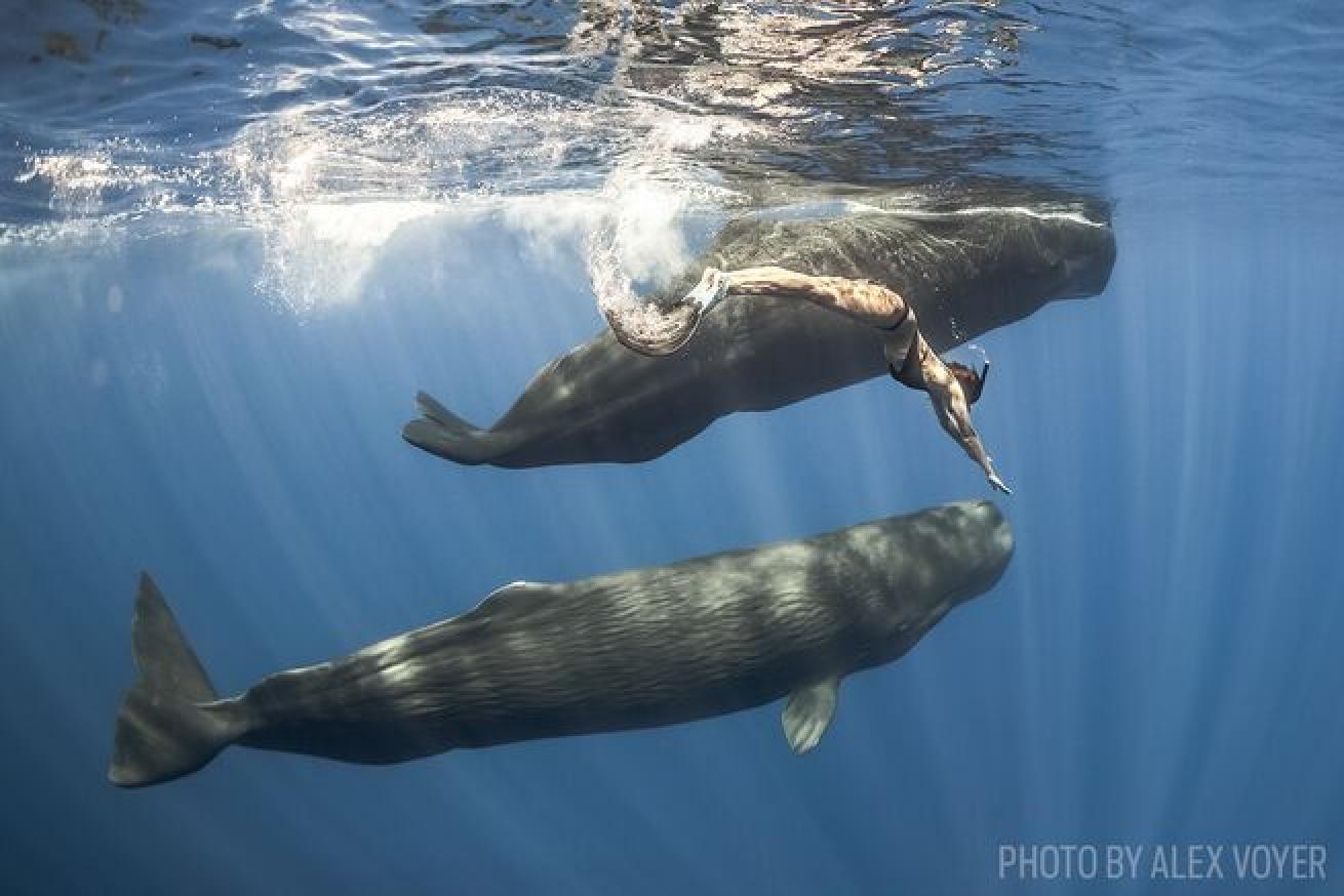 Alex VoyerA pod of sperm whales swims past a freediver off Sri Lanka